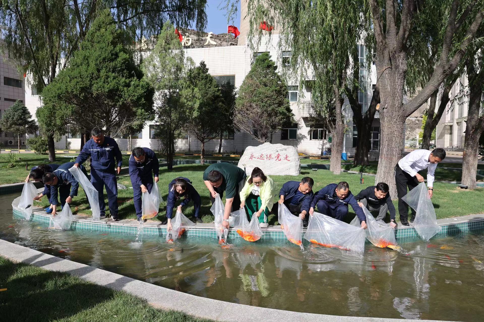“這水池里就差魚了。”這不,該公司合作商安徽艾普克斯智能科技有限公司主動提出要捐贈錦鯉魚。5月30日下午, 200余尾色彩斑斕的錦鯉魚送至公司花園處,該公司領導班子成員、員工代表和嘉賓一道,將活蹦亂跳的魚兒一同放入池中,錦鯉魚在池中愜意游躍,憨態可掬。