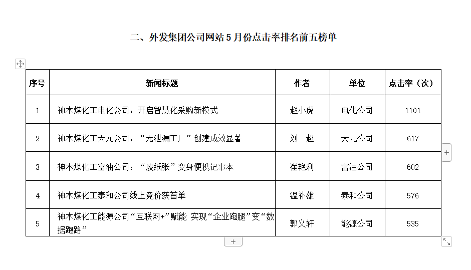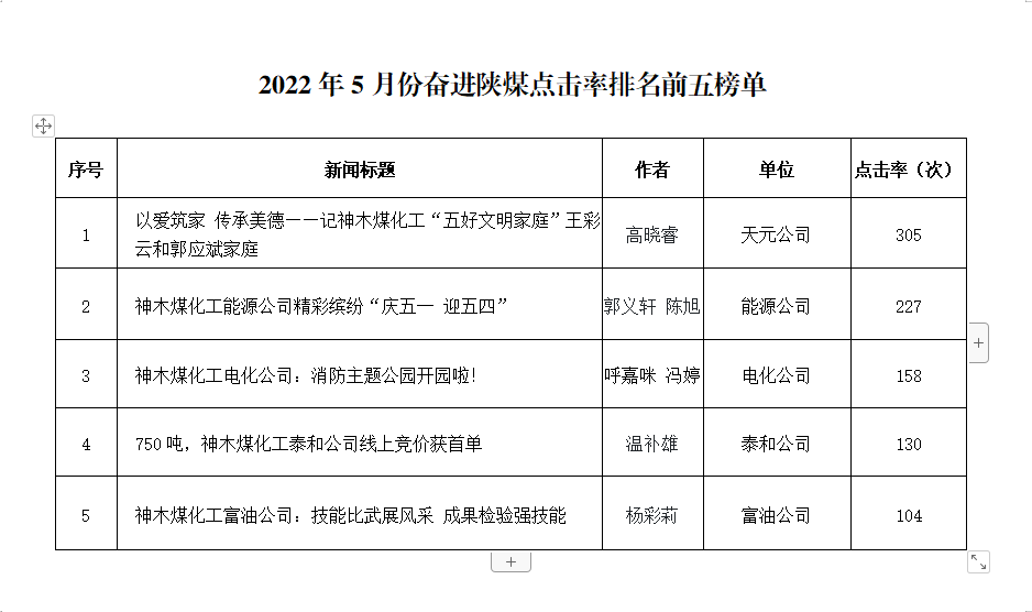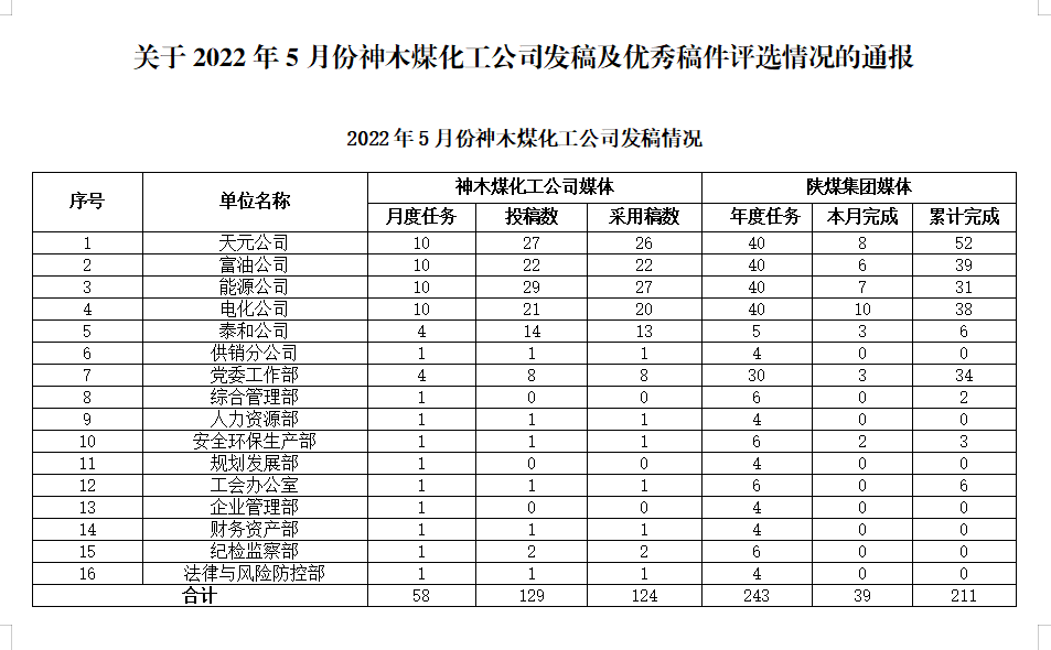 關于2022年5月份神木煤化工公司發稿及優秀稿件評選情況的通報