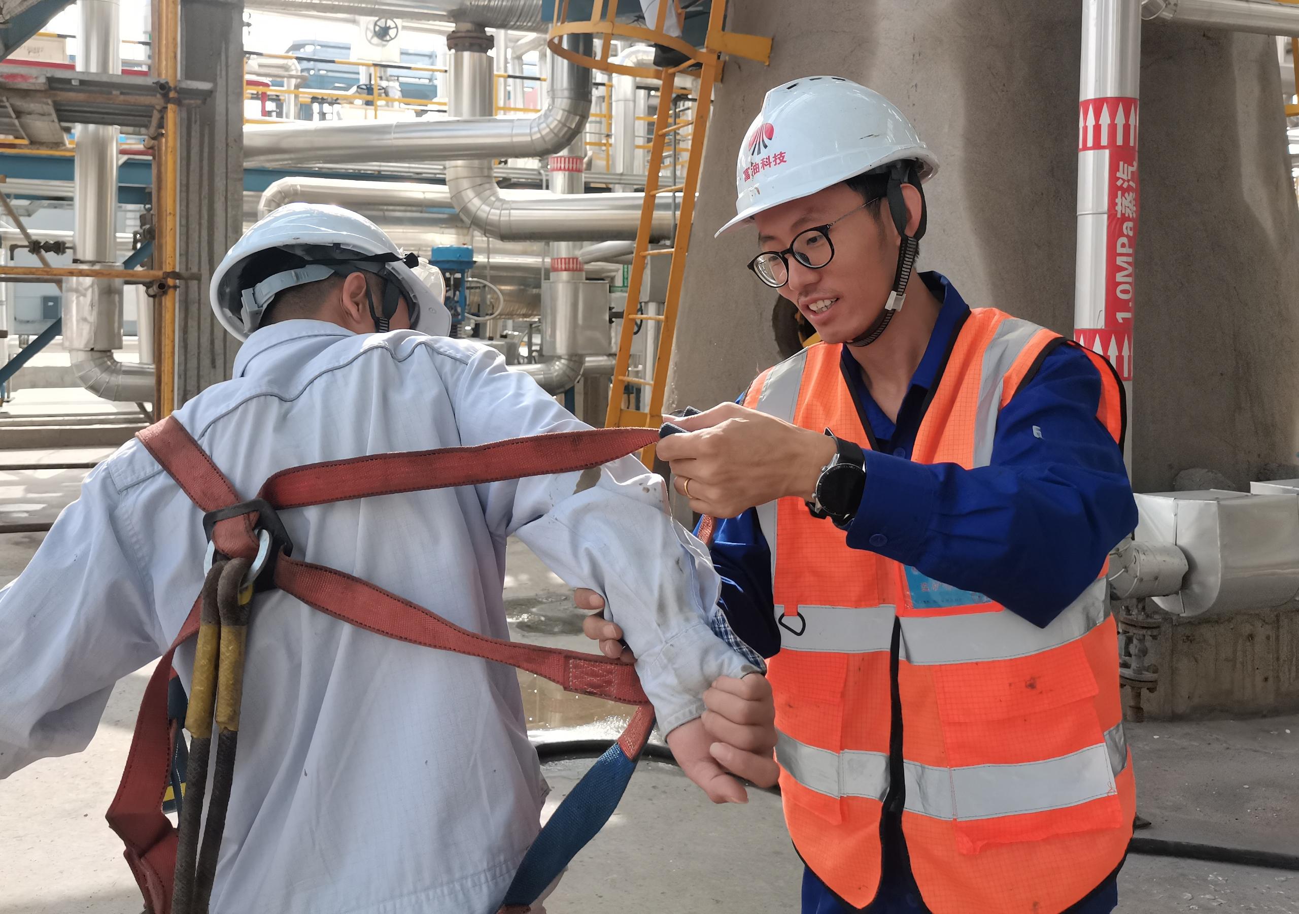 “師傅,這個全身式安全帶我?guī)湍愦┐骱?,先調(diào)整好安全帶的高低,防止太高,緊急情況下收緊勒到你脖子,對你的身體造成傷害,太低了無法限制身體向前沖,滑出肩膀就十分危險(xiǎn)了,留兩根手指的空隙比較合適,才能有效保障你的高處作業(yè)安全”,F(xiàn)TH中心班長張啟龍一邊說著一邊幫助檢修人員規(guī)范地系上了安全帶。