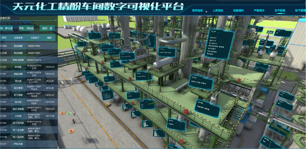 數字孿生項目實現了與現場裝置1:1三維立體建模的數字化,三維模型包含所有的PID圖、設備參數及供應商信息,通過引入DCS等系統的動態數據和人員三維定位,實現了車間物理實體裝置高精度的虛擬模型展示,解決了生產系統內外操作人員協同作業困難,大幅提升了一線員工的作業質量和工作效率。