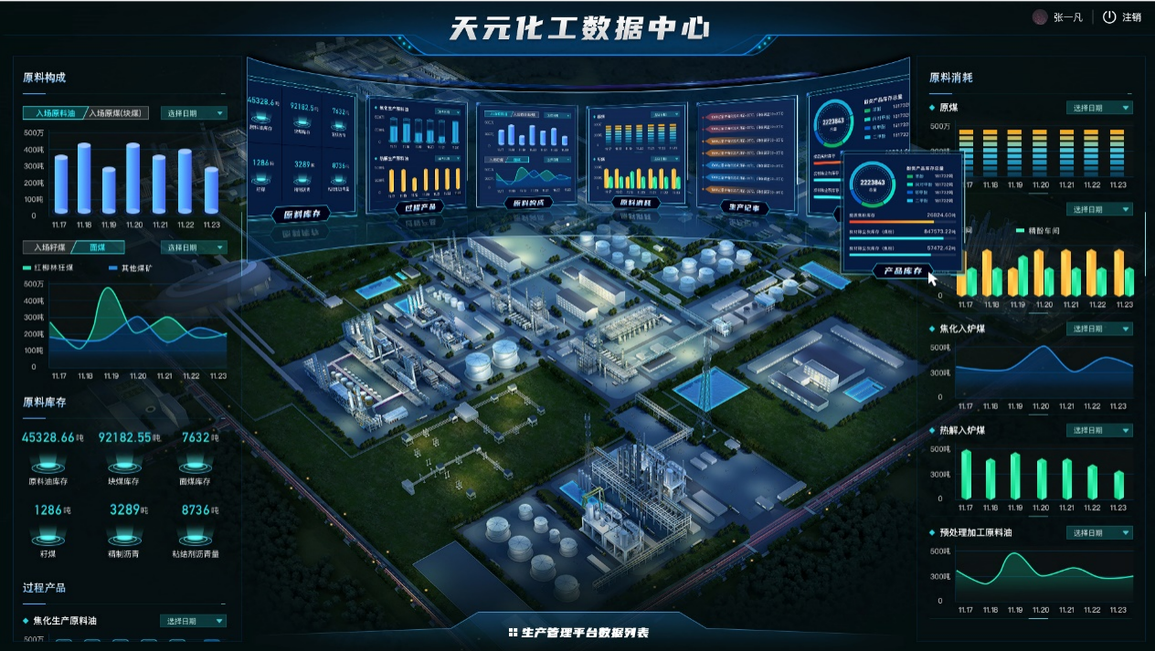 其中,數據中心項目通過對公司生產經營數據的挖掘與分析,建立的應用模型直觀展示了當前的生產經營狀態。目前,共有生產、銷售、采購、價格、環保等8個數據平臺,通過數據中心可以及時了解到公司的生產經營現狀,為企業經營決策提供可靠的數據支持。