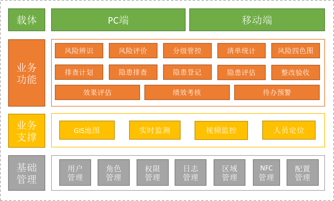 其中,風險分級管控功能模塊利用風險隱患庫的數據支撐,助力基層管理人員的風險辨識登記、評價分級、管控措施制定等一系列風險分級管控工作,實現了對安全管理風險源頭治理、關口前移,全面匯總管理區域內的風險隱患并輸出符合風險分級管控相關管理要素的清單、報表;隱患排查治理功能模塊涵蓋了安全隱患排查治理各環節基本要素和工作內容,通過PC端和手機APP實現以安全隱患排查治理業務為主線的移動線上管理,能夠對隱患排查治理及時、有效跟蹤,實現隱患排查、上報、整改、驗收、記錄留痕、表單存檔閉環管理;數據監測中心功能模塊基于電子地圖進行相關數據、信息展示服務,通過不同的圖層切換,實現危險源、安全隱患、特殊作業分布、有毒可燃氣體監測、視頻監控多種專題圖的可視化形象展示。