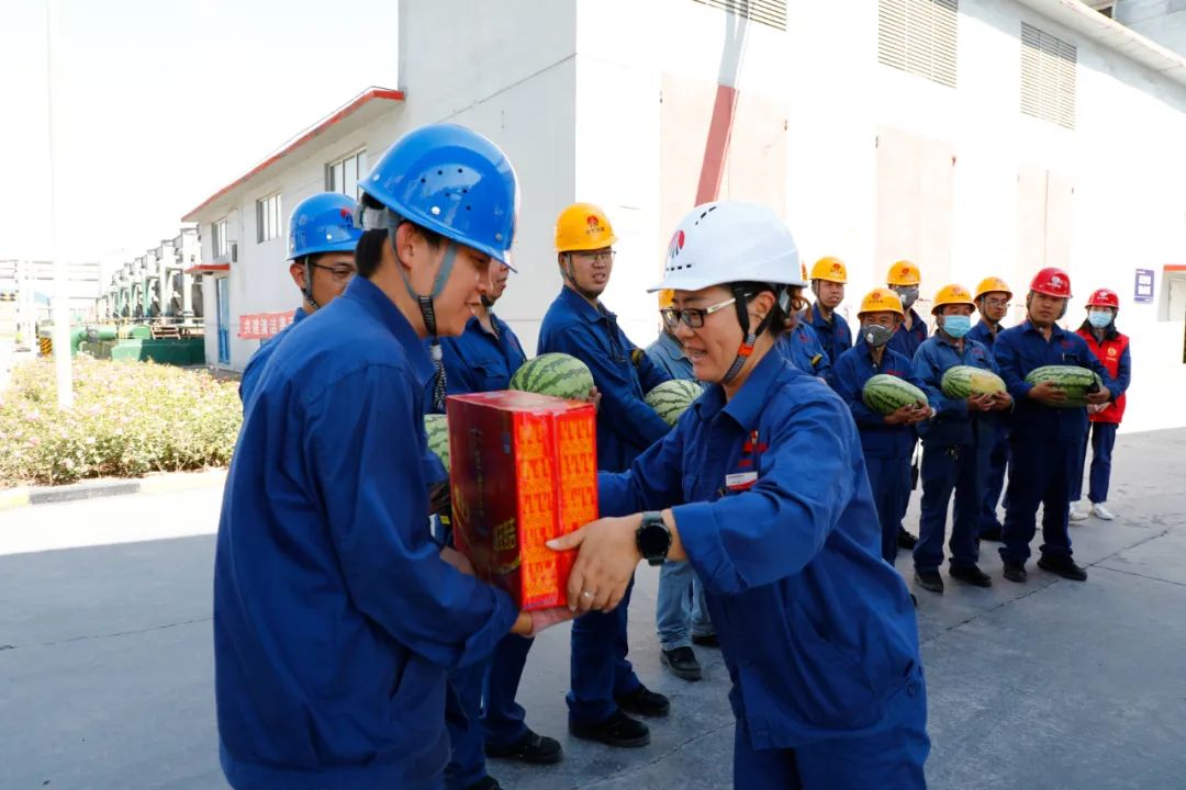能源公司領導感謝大家為安全生產付出的辛勤努力,同時,還與一線職工親切交流,詢問他們在高溫下的生產生活情況,叮囑大家要落實好防暑降溫保障措施,確保工作安全和自身安全。并要求各車間負責人要在保證安全和工作進度的情況下合理調配作息時間,做好安全生產和防暑工作。