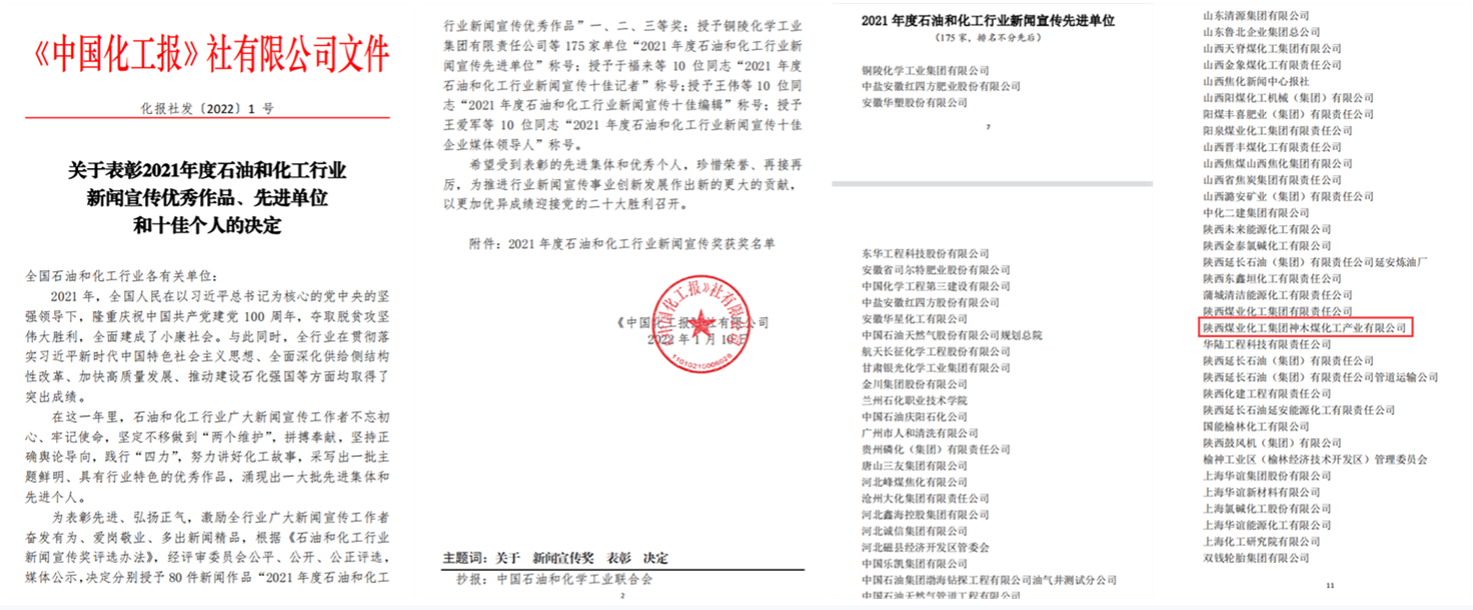 神木煤化工公司榮獲“2021年度石油和化工行業新聞宣傳先進單位”稱號