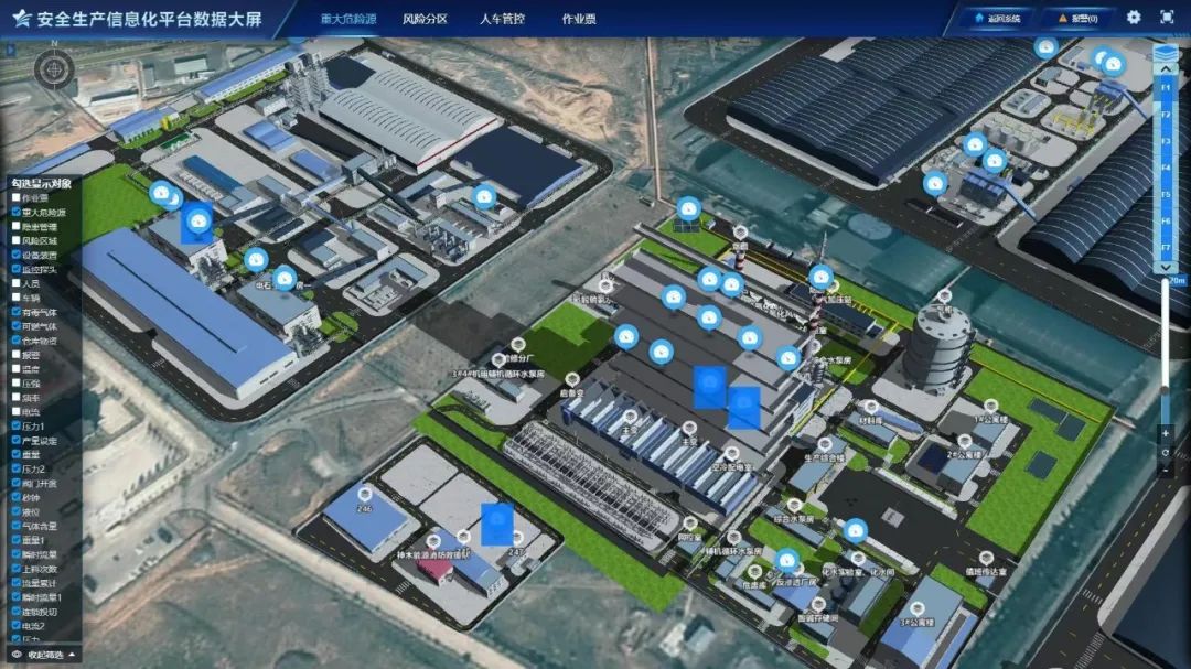 現(xiàn)該系統(tǒng)已完成智能“3D”建模并正式導(dǎo)入能源公司“安全生產(chǎn)信息化管理平臺(tái)”。該平臺(tái)基于化工安全管理理念,將線下業(yè)務(wù)融合進(jìn)線上系統(tǒng),并圍繞風(fēng)險(xiǎn)分級(jí)管控、隱患排查體系和化工過(guò)程安全,建設(shè)了重大危險(xiǎn)源監(jiān)測(cè)預(yù)警系統(tǒng)(合并有毒可燃?xì)怏w監(jiān)測(cè)預(yù)警)、風(fēng)險(xiǎn)隱患雙預(yù)防管理系統(tǒng)、安全生產(chǎn)全流程系統(tǒng)、以及人員在崗在位管理系統(tǒng),實(shí)現(xiàn)了多種業(yè)務(wù)的信息化管理。管理人員可通過(guò)鳥瞰、“3D”視圖、局部特寫等形式,對(duì)生產(chǎn)線、工藝流程、生產(chǎn)設(shè)備進(jìn)行可視化管控。