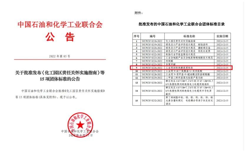 近日,由天元公司牽頭制定的《工業用回轉熱解提質焦粉》(T/CPCIF 0226-2022)團體標準獲中國石油和化學工業聯合會批準發布。