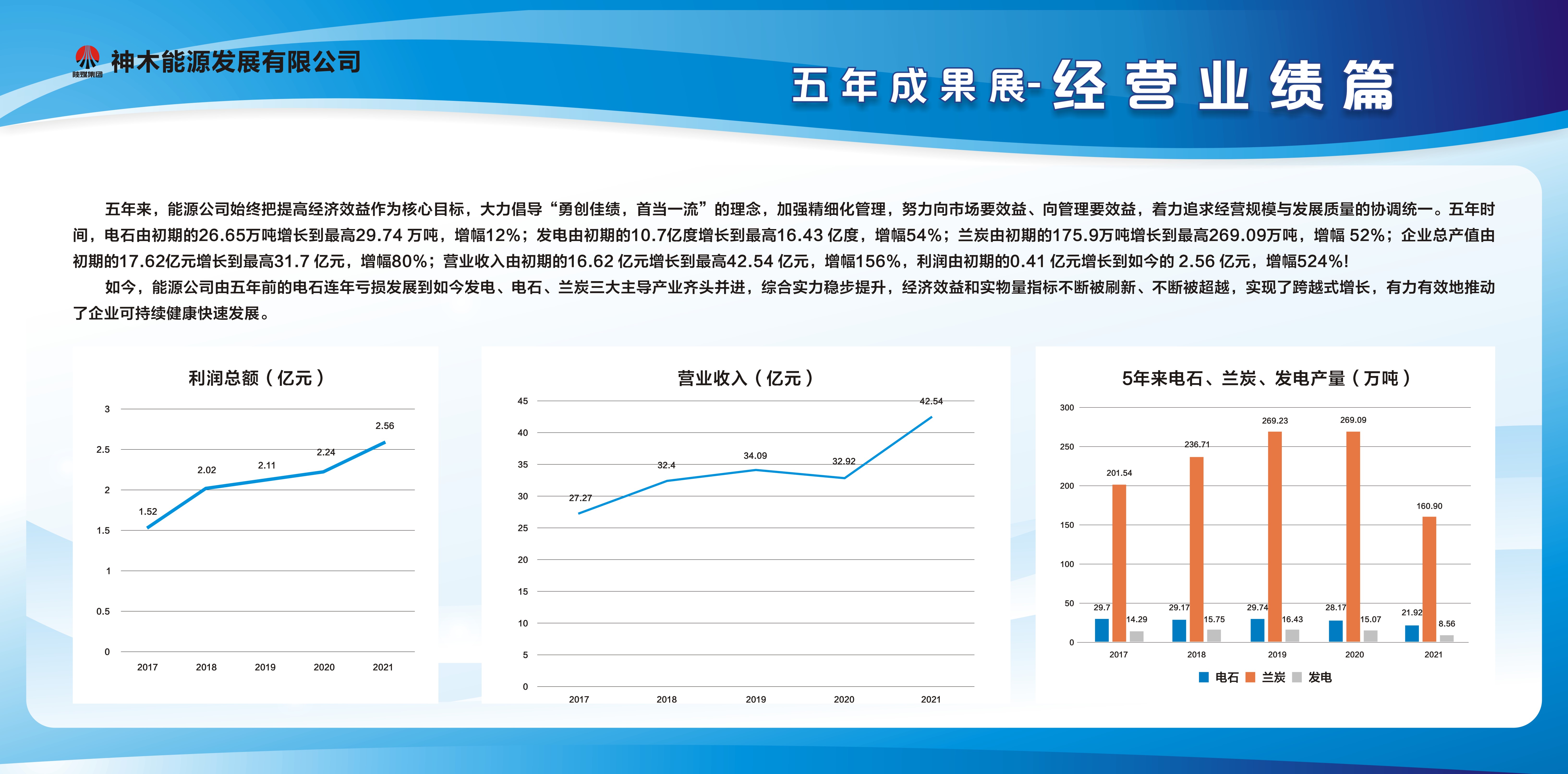 本次成果展生動展現了5年來能源公司在陜煤集團及神木煤化工公司領導下,改革創新、高質量發展的奮斗歷程。整個展覽分為“黨建成果篇”“安全智能篇”“黨風廉政篇”“經營業績篇”“戰略發展篇”“技術創新篇”“職工生活篇”等七大版塊??偨Y了5年來,在陜煤集團及神木煤化工公司的正確領導下,能源公司踔厲揚帆、礪砥前行,從五年前的電石連年虧損,到如今的發電、電石、蘭炭三大主導產業齊頭并進,再到240萬噸/年蘭炭產業轉型升級的全面完成,以匠心和恒心推動企業前行,助力能源公司高質量發展。
