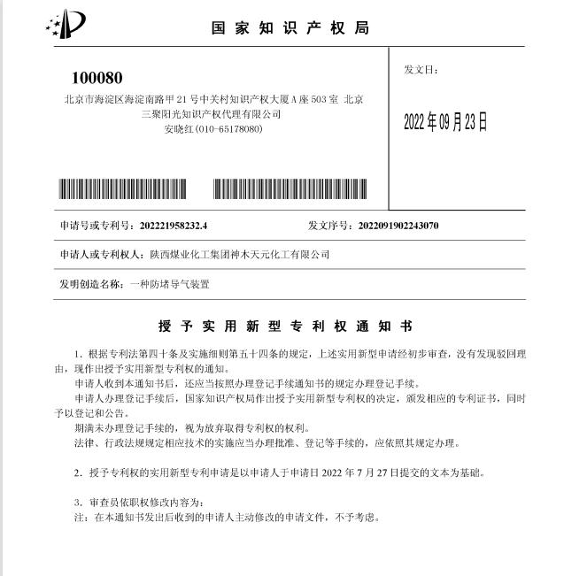 近日,神木煤化工天元公司申請的“一種防堵導氣裝置”實用新型專利獲得國家知識產權局授權。
