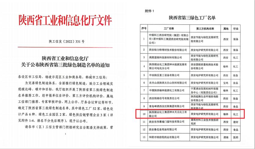 近日,從陜西省工業和信息化廳下發的《關于公布陜西省第三批綠色制造名單的通知》獲悉,神木煤化工天元公司入選陜西省第三批綠色工廠名單。
