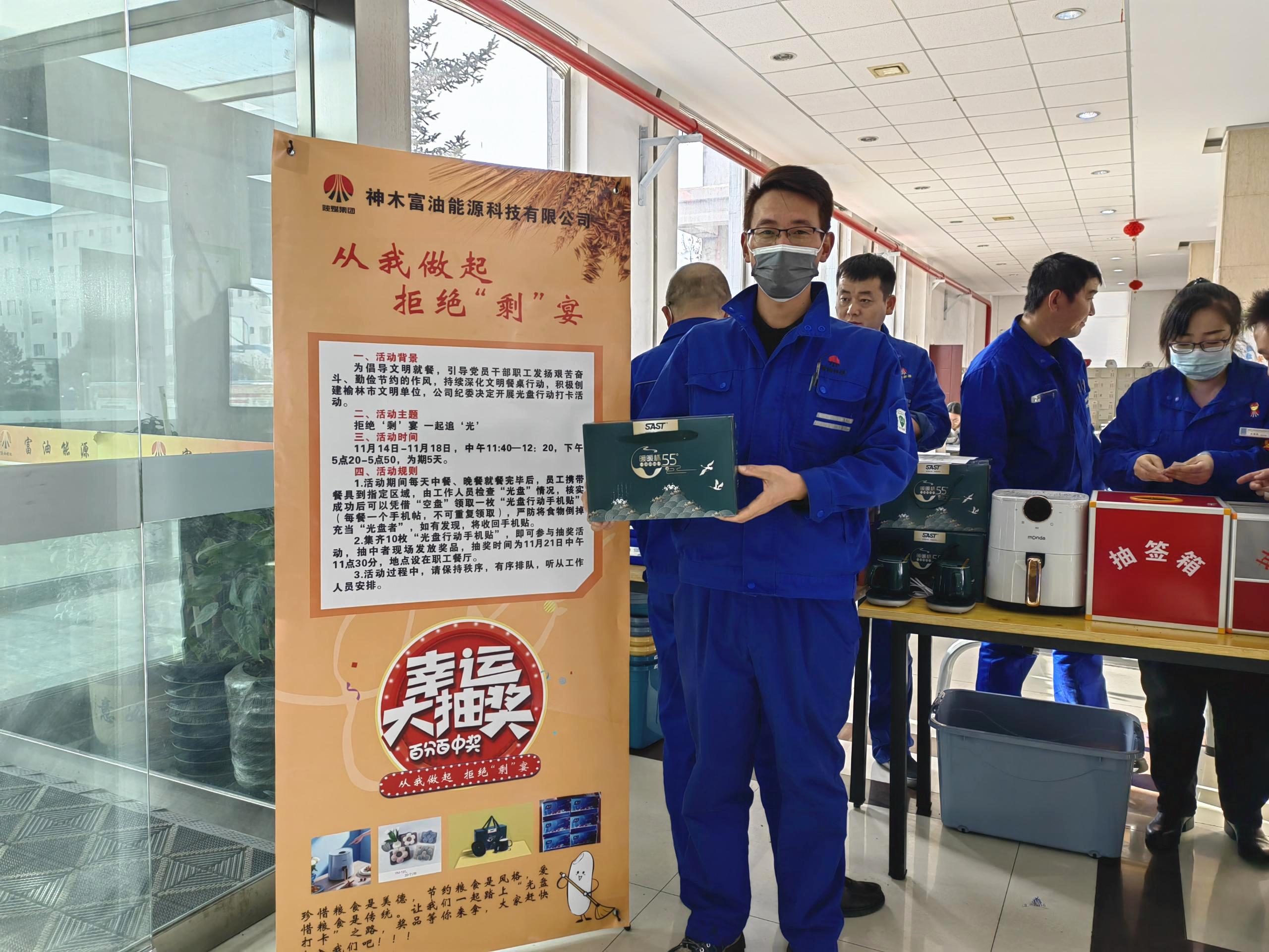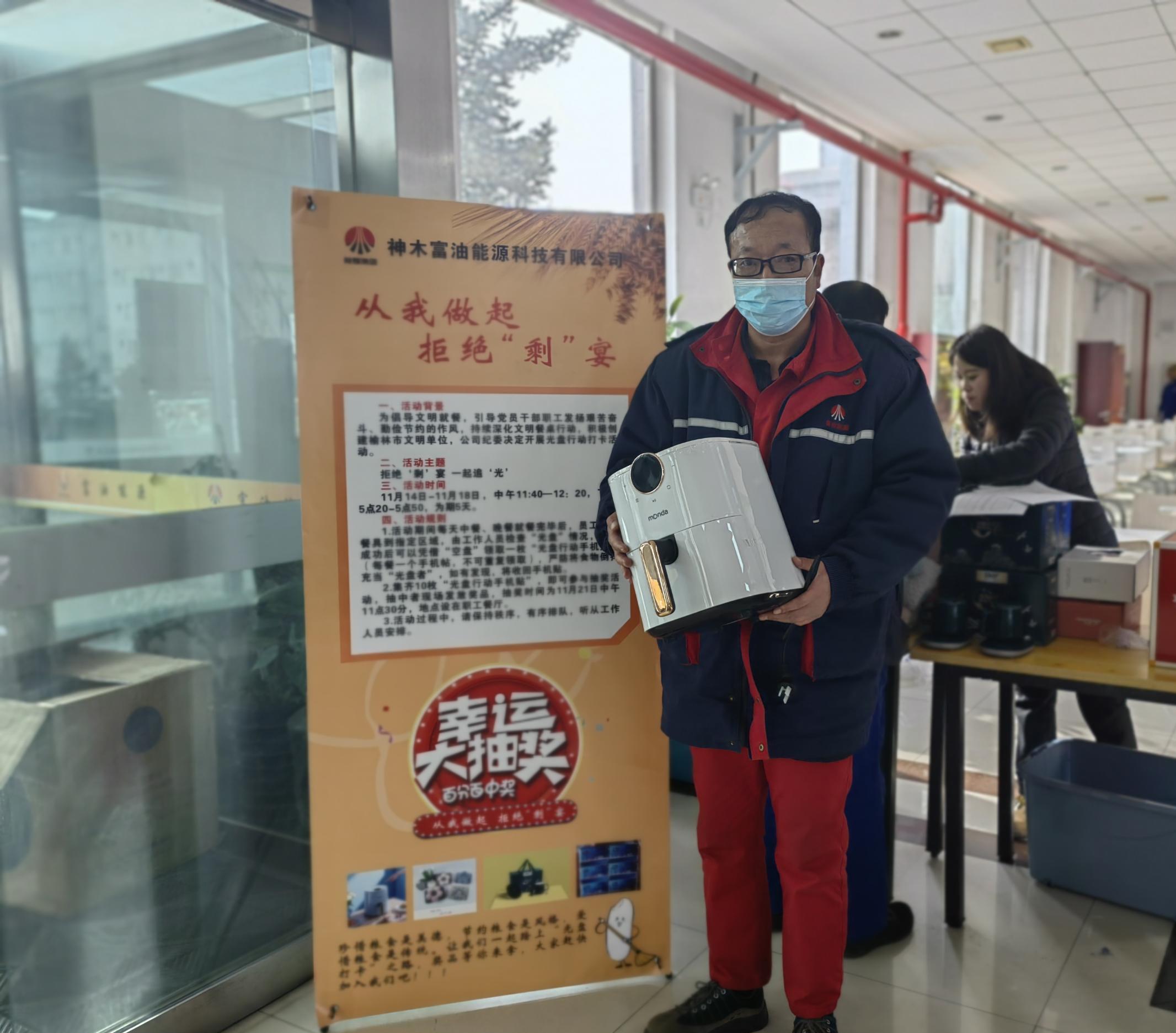 “我已經(jīng)連續(xù)5天光盤,獲得了紅、橙、藍(lán)、綠、紫五種顏色卡共10張,希望能抽到大獎。”抽獎現(xiàn)場的一名青年員工說。“果然有大獎,今天抽到了老婆心心念的空氣炸鍋,真開心啊!在今后的工作和生活中,我將用自身的實際行動帶動我周圍的同事、還有我的家人杜絕舌尖上的浪費。”保運中心蘇永紅開心的說。