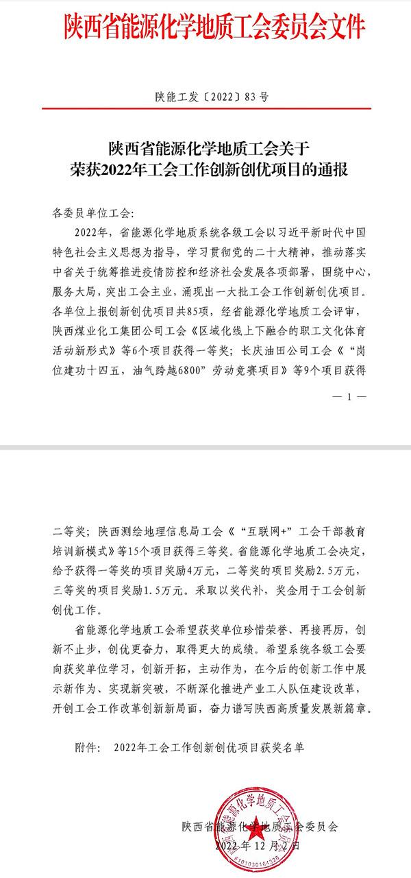 電化公司榮獲2022年陜西省能源化學地質工會工作創新創優項目三等獎
