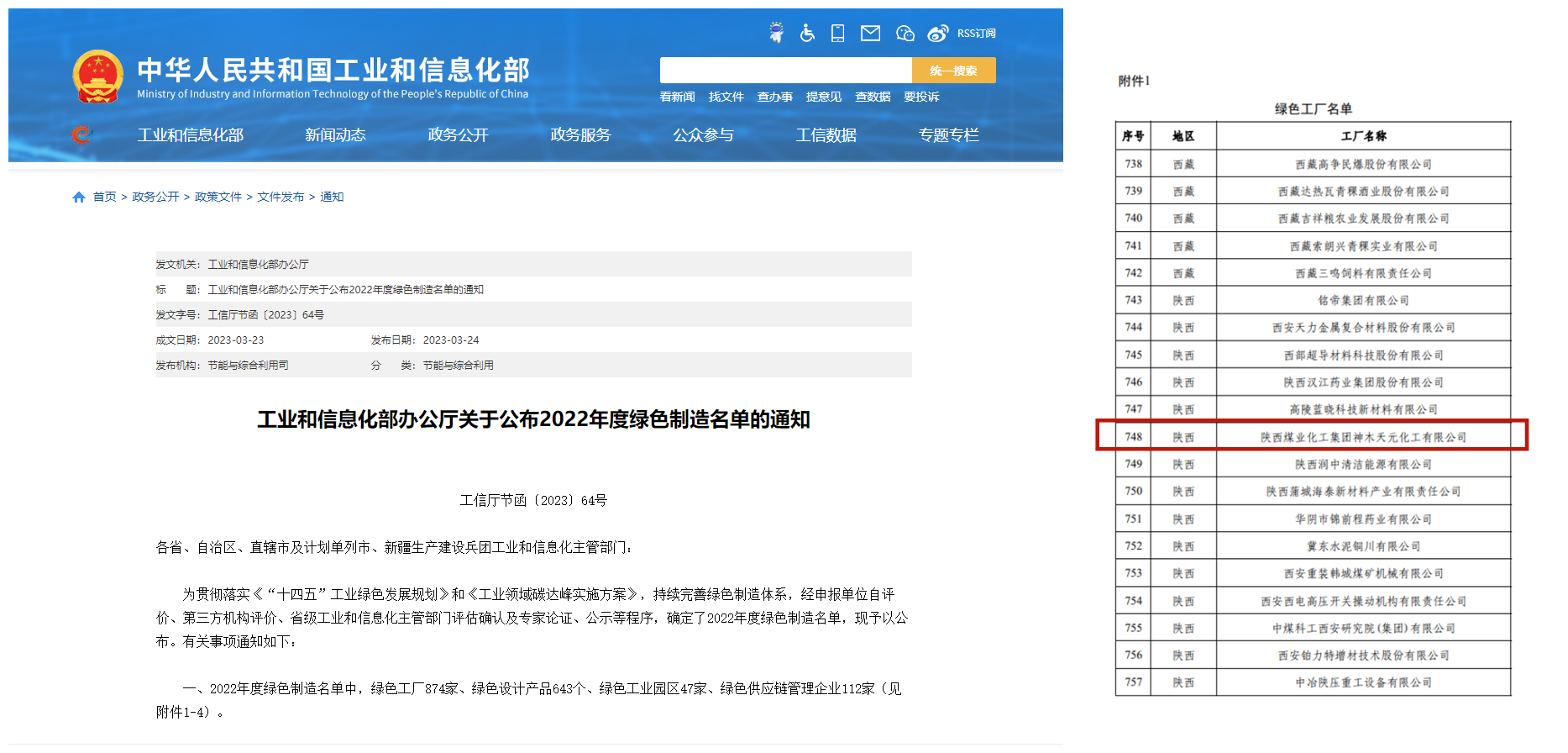 近日,從工業(yè)和信息化部辦公廳下發(fā)的《關于公布了2022年度綠色制造名單的通知》獲悉,神木煤化工天元公司獲批國家級綠色工廠。