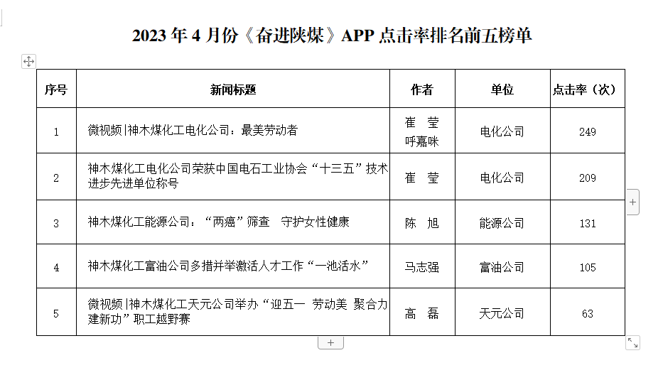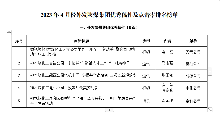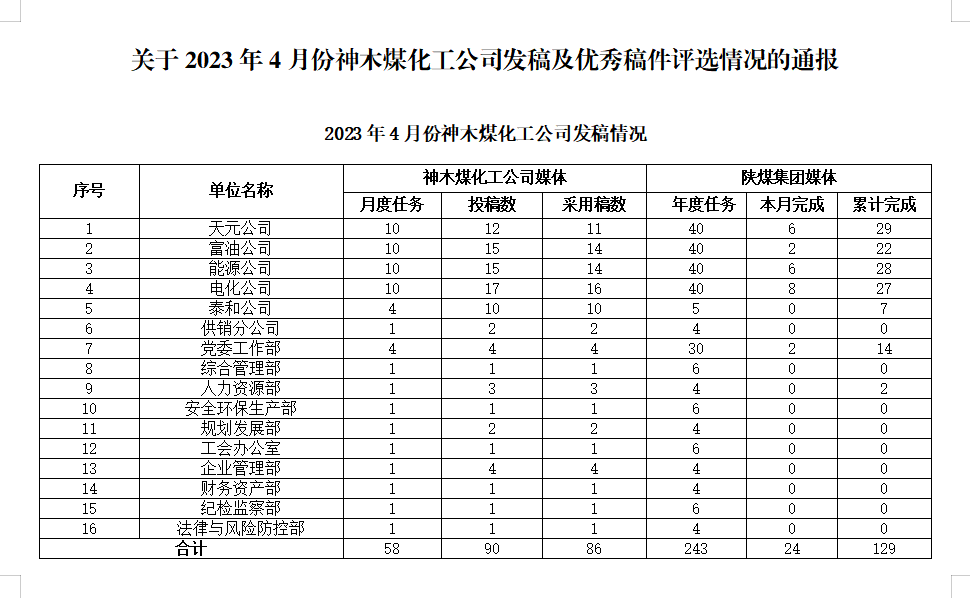 關于2023年4月份神木煤化工公司發稿及優秀稿件評選情況的通報
