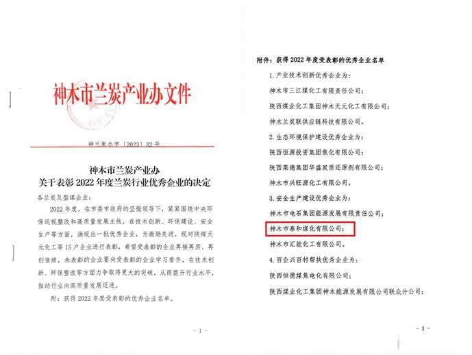 近日,從神木市蘭炭產(chǎn)業(yè)發(fā)展工作領導小組獲悉,神木煤化工泰和公司榮獲“安全生產(chǎn)建設優(yōu)秀企業(yè)”稱號。