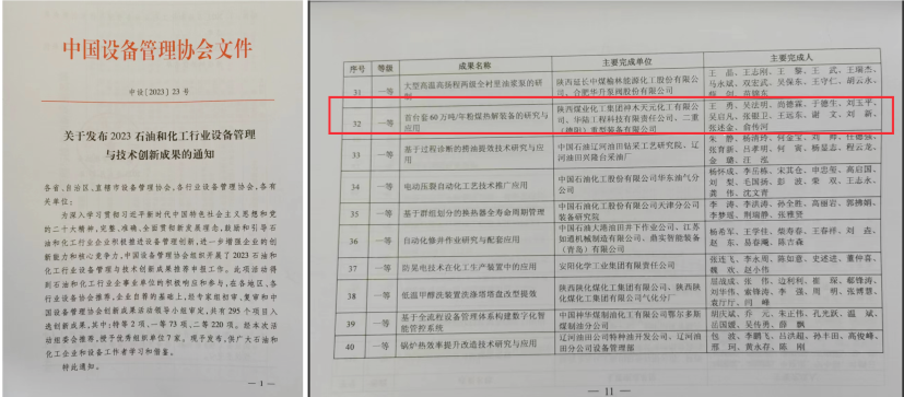 近日,中國設(shè)備管理協(xié)會下發(fā)了《關(guān)于發(fā)布2023年石油和化工行業(yè)設(shè)備管理與技術(shù)創(chuàng)新成果的通知》,神木煤化工天元公司與華陸工程科技有限責(zé)任公司、二重(德陽)重型裝備有限公司合作開發(fā)的“首臺套60萬噸/年粉煤熱解裝備的研究與應(yīng)用”技術(shù)創(chuàng)新成果榮獲一等獎。