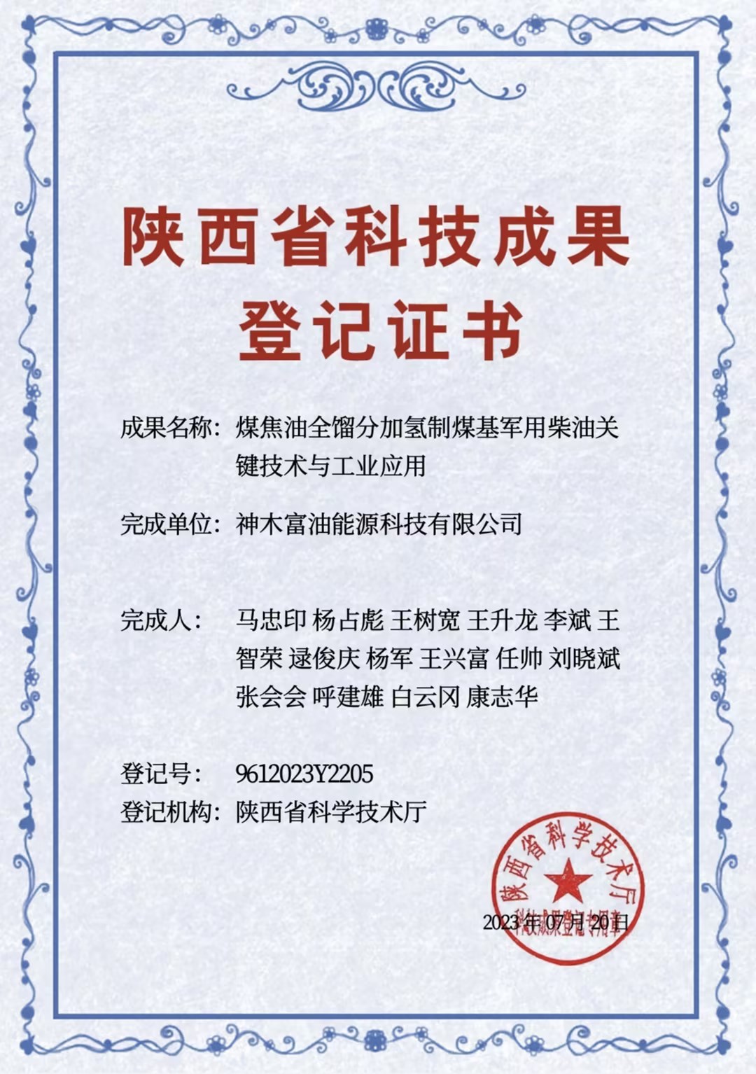 近日,神木煤化工富油公司兩個重點科技項目《中低溫煤焦油全餾分加氫制煤基航天煤油關鍵技術與工業(yè)應用》《中低溫煤焦油全餾分加氫制特種柴油關鍵技術與工業(yè)應用》獲得陜西省科學技術廳頒發(fā)的科技成果登記證書。