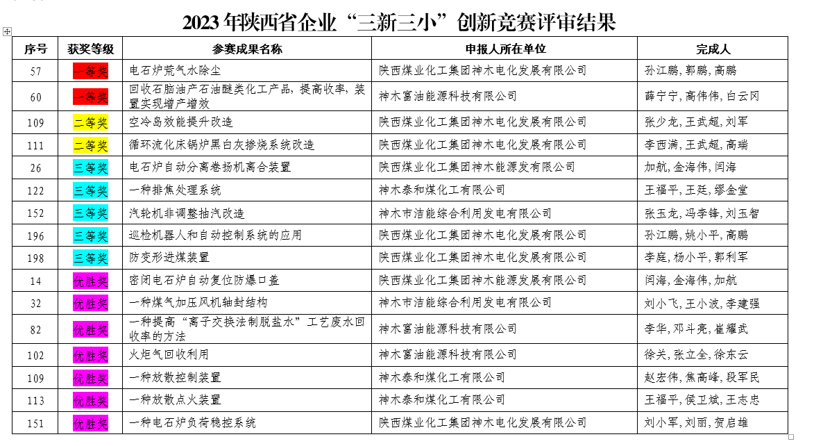 近日,神木煤化工電化公司在2023年陜西省企業(yè)“三新三小”創(chuàng)新競賽活動中喜獲6項(xiàng)榮譽(yù),其中一等獎1項(xiàng)、二等獎2項(xiàng)、三等獎2項(xiàng)、優(yōu)勝獎1項(xiàng)。