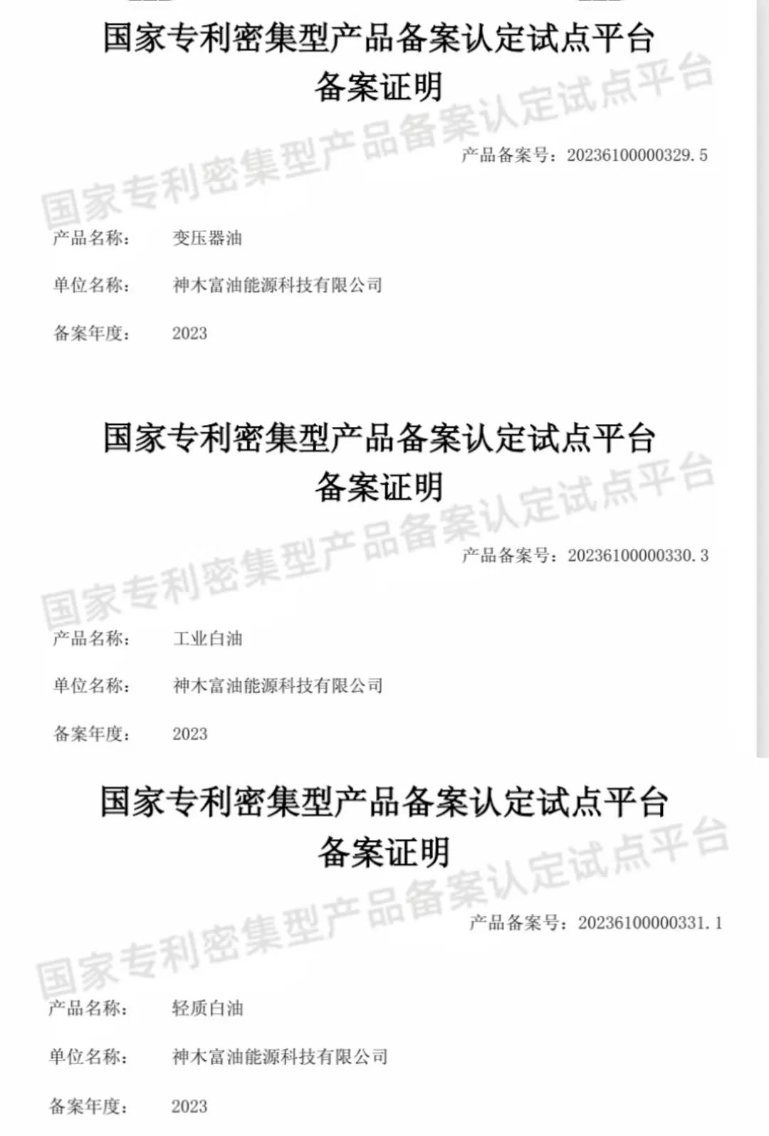 近日,神木煤化工富油公司生產(chǎn)的工業(yè)白油、輕質(zhì)白油、變壓器油在國家專利密集型產(chǎn)品備案認(rèn)定試點平臺備案成功。