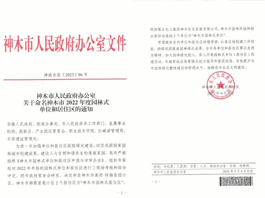 電化公司榮獲“2022年度神木市園林式單位”榮譽稱號