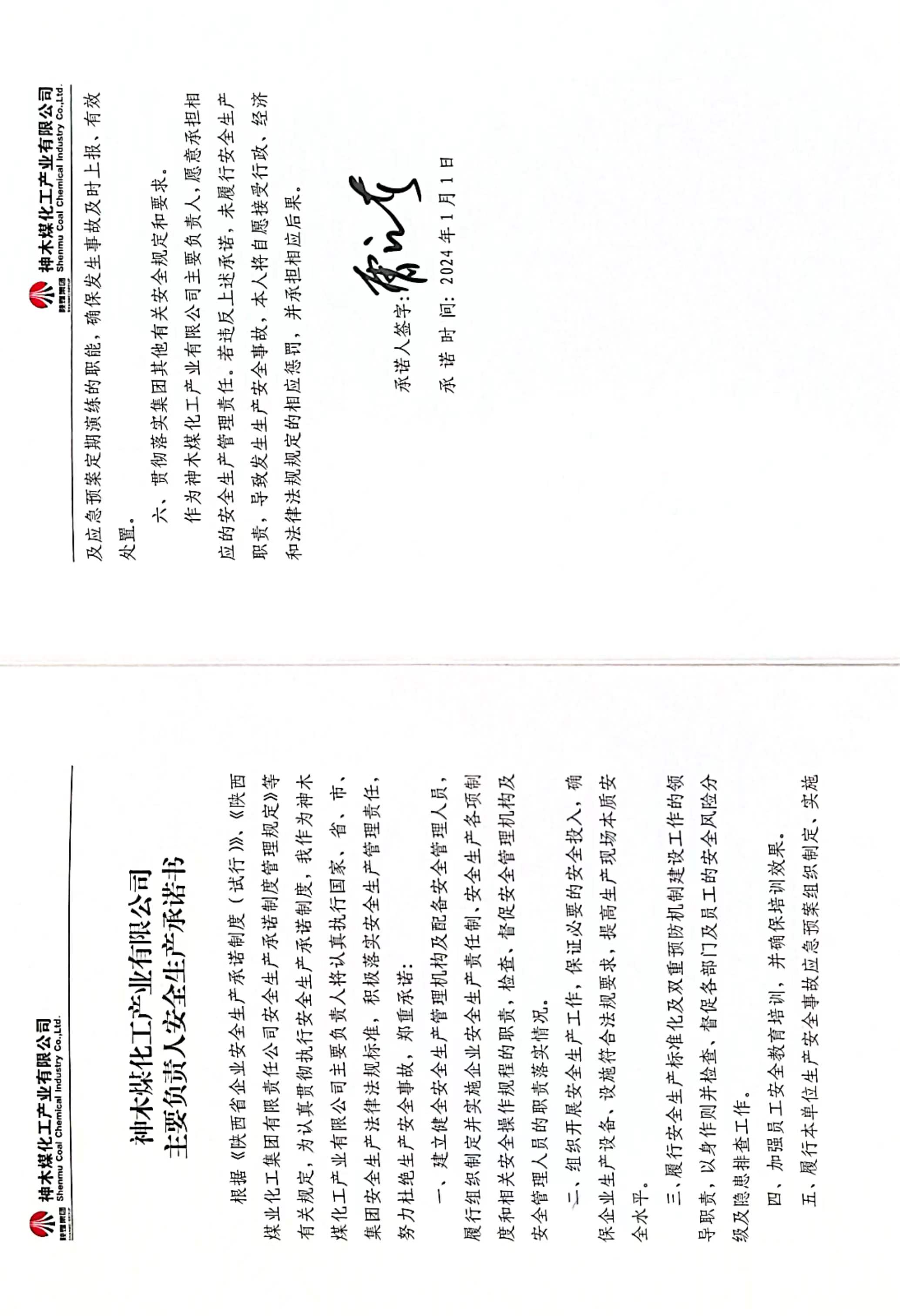 神木煤化工產業有限公司2024年度主要負責人安全生產承諾書