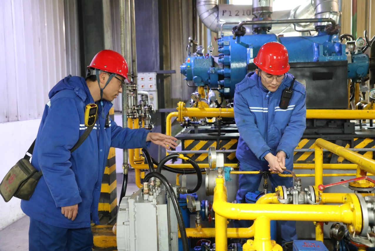 加氫車間黃海倫指導班員李盼盼調節高壓泵潤滑油壓力