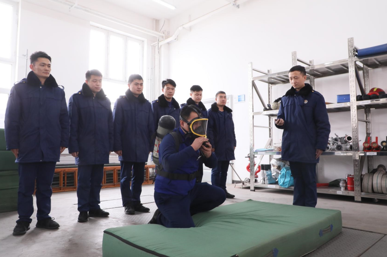 消防隊隊員在進行原地佩戴空氣呼吸器訓練