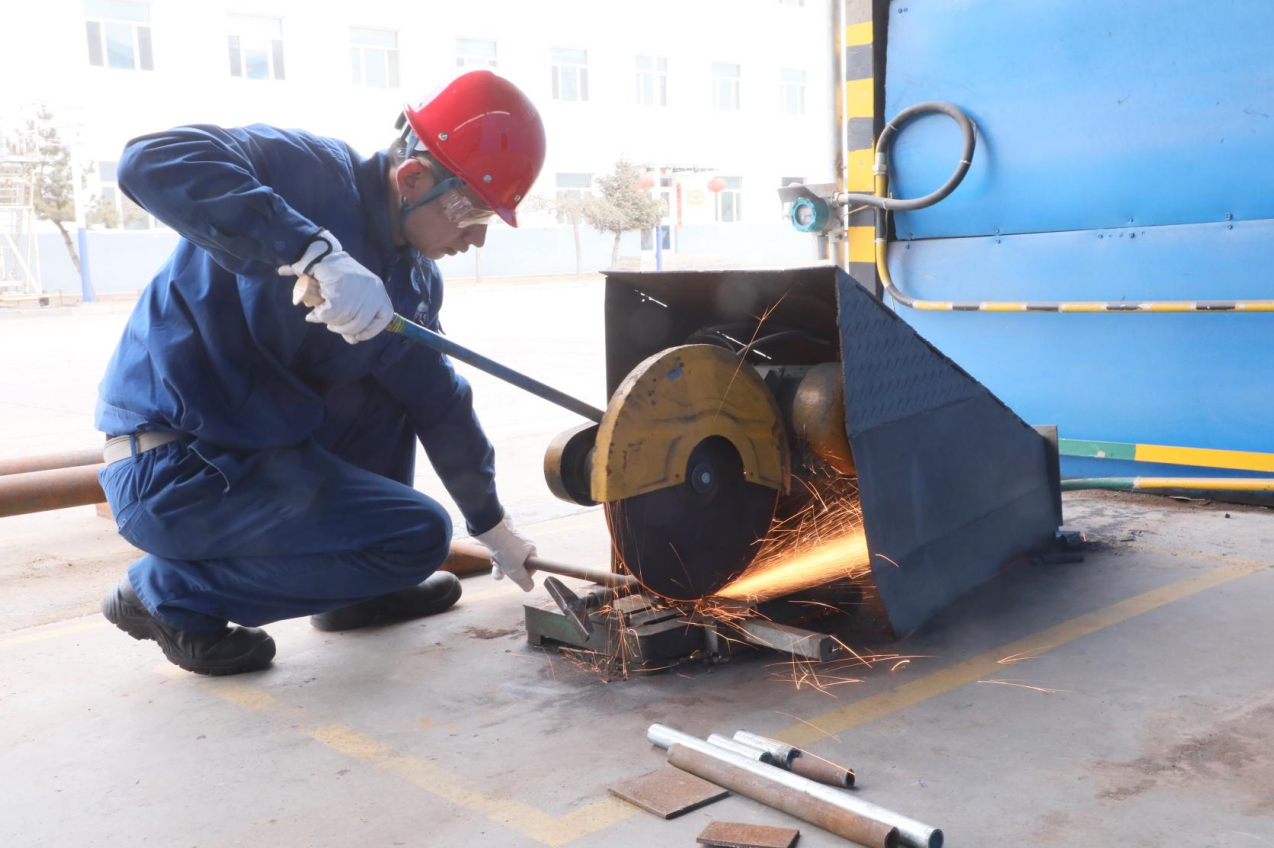 檢修車間王西鶴在利用廢舊材料制作備用夾具