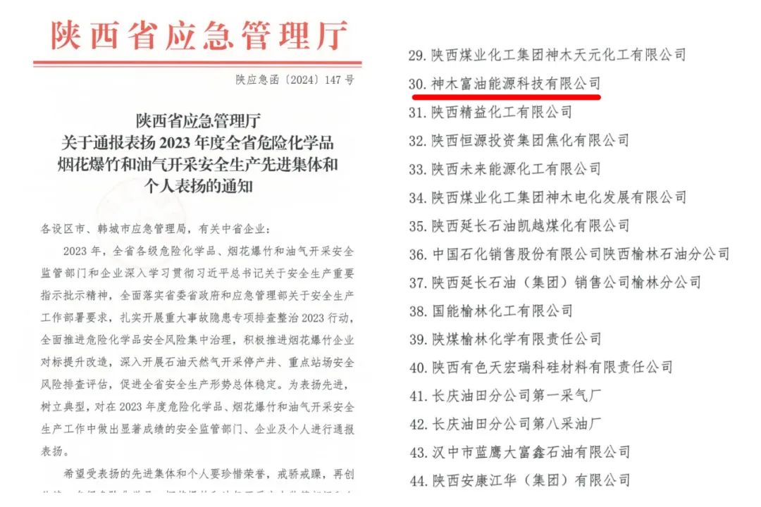 近日,陜西省應急管理廳對2023年度全省危險化學品、煙花爆竹和油氣開采安全生產先進集體和個人予以通報表揚,神木煤化工富油公司榮獲“2023年度陜西應急管理廳危險化學品行業安全生產先進集體”稱號。