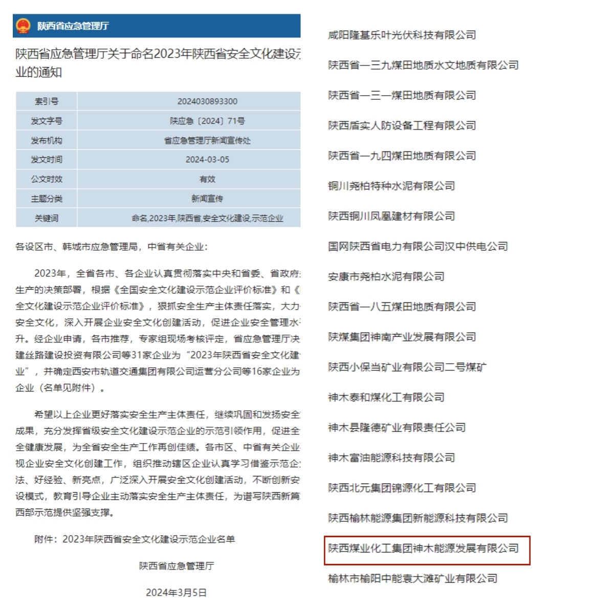 3月5日,陜西省應急管理廳印發《陜西省應急管理廳關于命名2023年陜西省安全文化建設示范企業的通知》,神木煤化工能源公司獲評“2023年陜西省安全文化建設示范企業”,該榮譽稱號是該公司安全管理工作全方位、綜合性的考核評價,更是該公司在安全文化建設工作方面成效顯著的重要標志。
