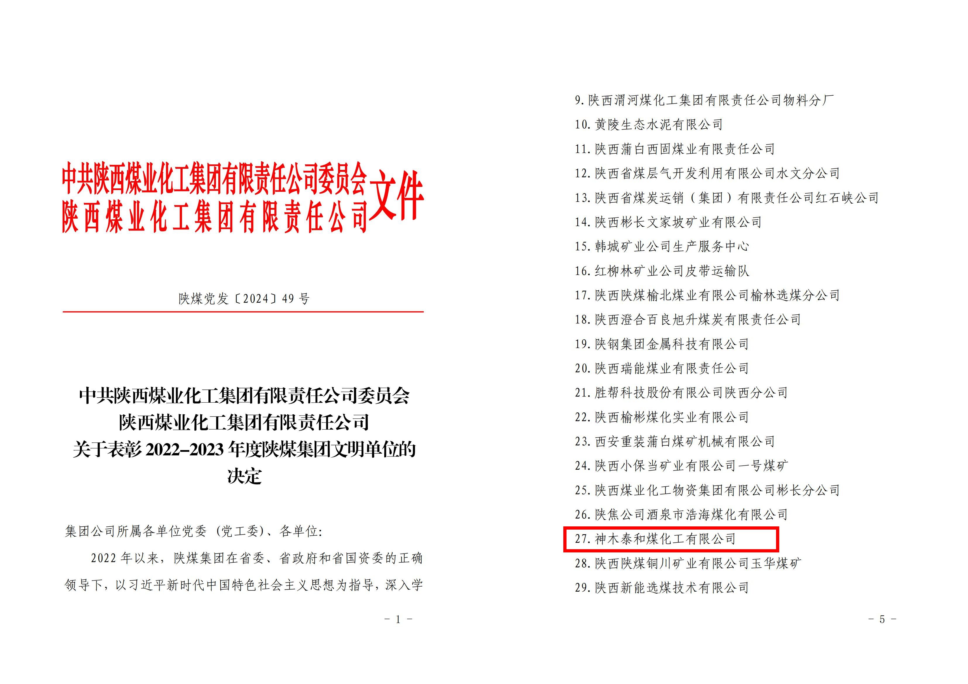 近日,在陜煤集團2023年度文明單位、勞動模范、陜煤工匠表彰大會中獲悉,神木煤化工泰和公司獲得2022-2023年度陜煤集團文明單位榮譽稱號。