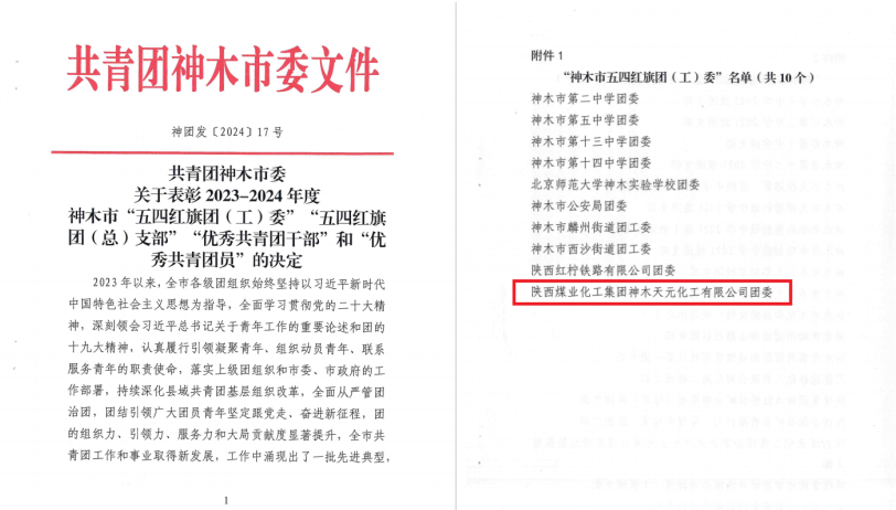 近日,共青團(tuán)神木市委下發(fā)了《關(guān)于表彰2023-2024年度神木市“五四紅旗團(tuán)(工)委”“五四紅旗團(tuán)(總)支部”“優(yōu)秀共青團(tuán)干部”和“優(yōu)秀共青團(tuán)員”的決定》,神木煤化工天元公司團(tuán)委榮獲2023-2024年度神木市“五四紅旗團(tuán)委”榮譽稱號。