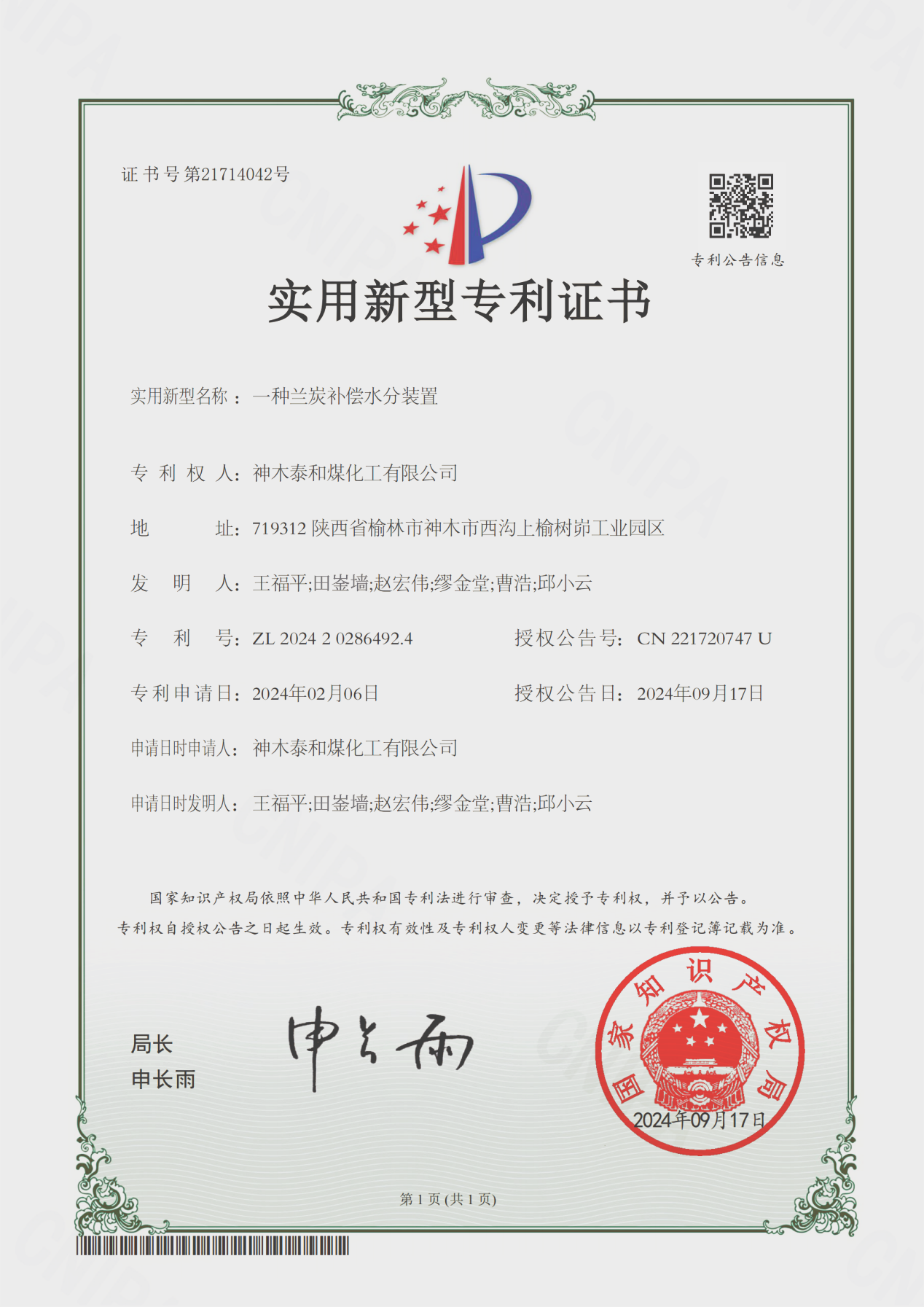 9月17日,泰和公司自主研發的“一種蘭炭補償水分裝置”獲得國家知識產權局實用新型專利授權。