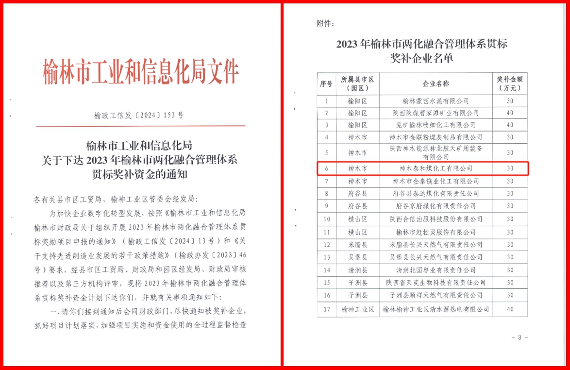 近日,根據榆林市工業和信息化局文件通知,泰和公司獲得2023年榆林市兩化融合管理體系貫標獎勵30萬元,成為神木市蘭炭行業首家獲得該項獎勵的企業。