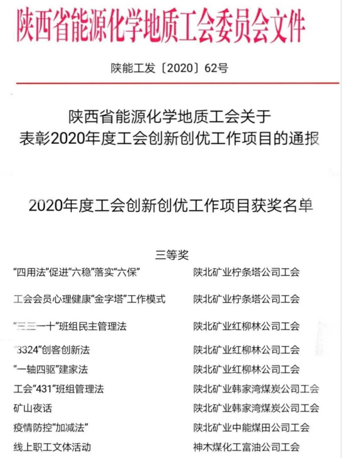 近日,富油公司工會申報的《線上職工文體活動》項目,榮獲2020年陜西省能源化學地質協會工會創新創優三等獎。
