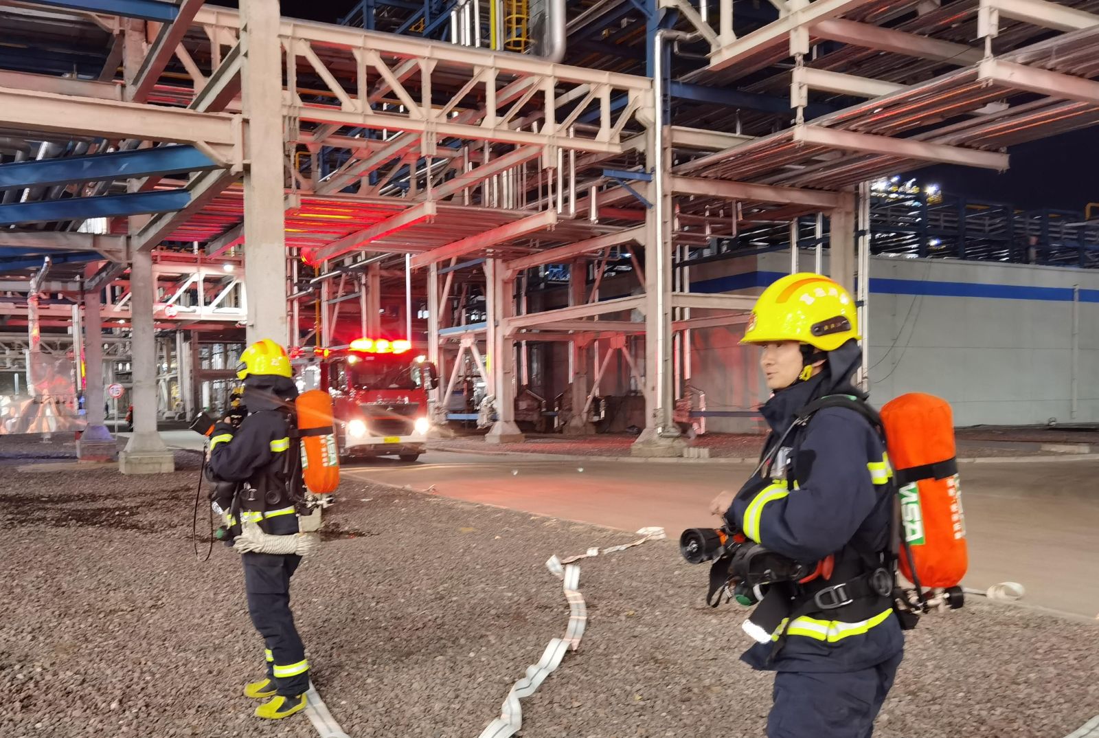 3月11日晚,富油公司二期項目裝置區突然警笛大作,三輛消防車和大量消防人員出現在裝置區,一場夜間消防實戰拉動演練正在上演。