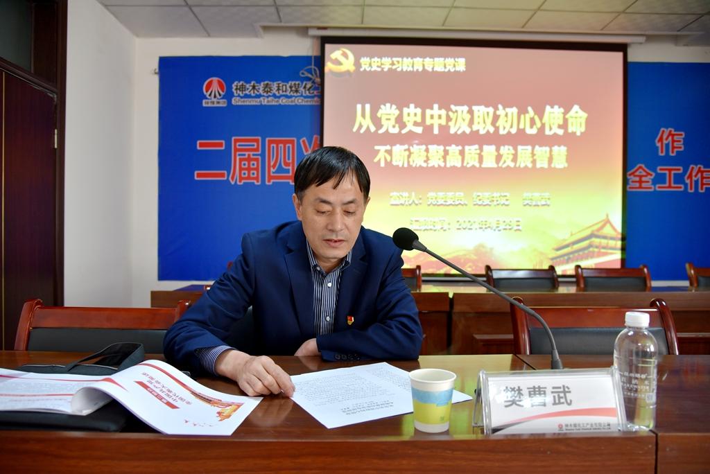 強調要求全體黨員干部特別是領導干部,要始終牢記黨的初心和使命,不斷增強“四個意識”、堅定“四個自信”、做到“兩個維護”,把初心和使命轉變成銳意進取、開拓創新的精氣神和埋頭苦干、真抓實干的原動力。從黨史中汲取追趕超越的動力,從黨史中汲取高質量發展的智慧,從黨史中尋找我們的初心使命,從黨史中淬煉靈魂,提升修養,全面推進技術創新再出新成果,在生產經營、安全環保管理再上新臺階,全面推進從嚴治黨不斷向縱深發展,努力為泰和公司、神木煤化工的高質量跨越發展貢獻智慧和力量。
