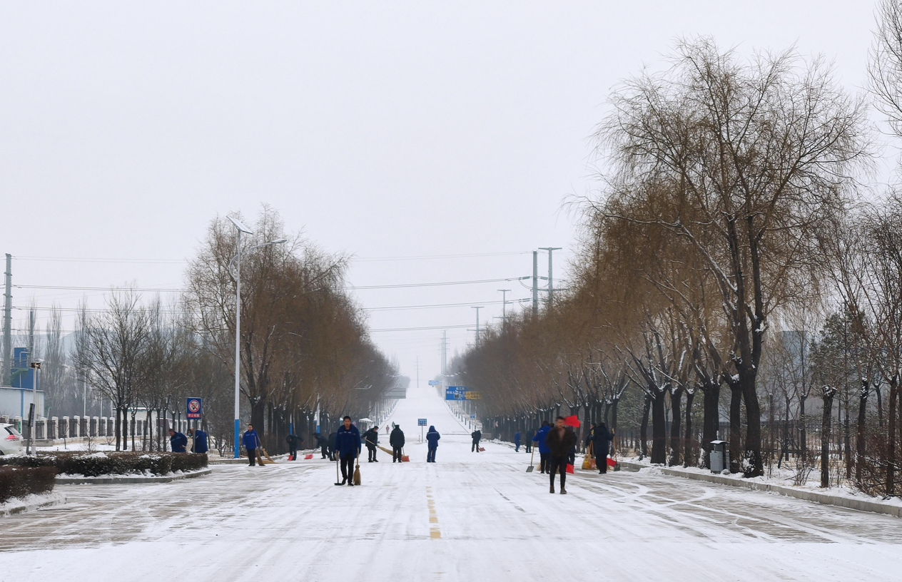 這首催眠曲,沒有將堅(jiān)守在這里的一線煤化工人催眠,他們以雪為令,將路面上的積雪清掃干凈。這些小精靈,似乎與這里的煤化工人開著玩笑,悄悄的藏在他們的身后,在空中飛舞,在枝丫間撒著潔白的花瓣,在他們的身邊盤旋,在他們的耳邊低語,與他們捉迷藏,如花絮般,紛紛揚(yáng)揚(yáng),又將清掃的路面悄悄地藏了起來,把大地瞬間變成了白色的海洋。