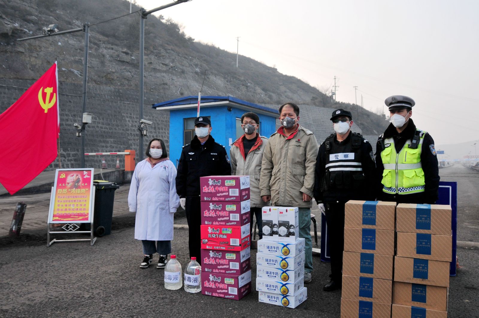 2月7日,在位于沙梁村道路上的疫情防控交通管控檢查點(diǎn),東鑫垣公司為廟溝門(mén)鎮(zhèn)派出所的執(zhí)勤人員送去消毒液、口罩、水、牛奶、方便面等慰問(wèn)物資,表達(dá)企業(yè)對(duì)地方政府開(kāi)展疫情防控工作的一份支持。(馬佳亮)
