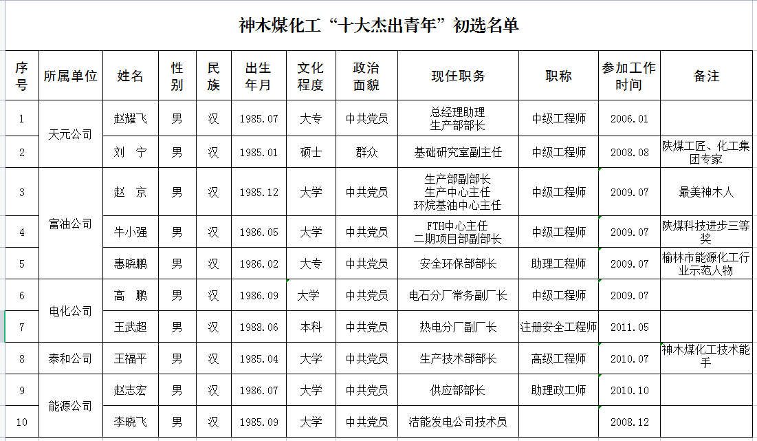 公司“十大杰出青年”評選活動于3月份啟動以來,經歷人選推報、資格審查、評審確定等環節,在“公平、公正、公開”的基礎上產生了“十大杰出青年”?,F將評選結果予以公示。如對公示人選持有異議,歡迎廣大干部職工向活動組委會辦公室(黨委工作部)反映情況。具體如下: