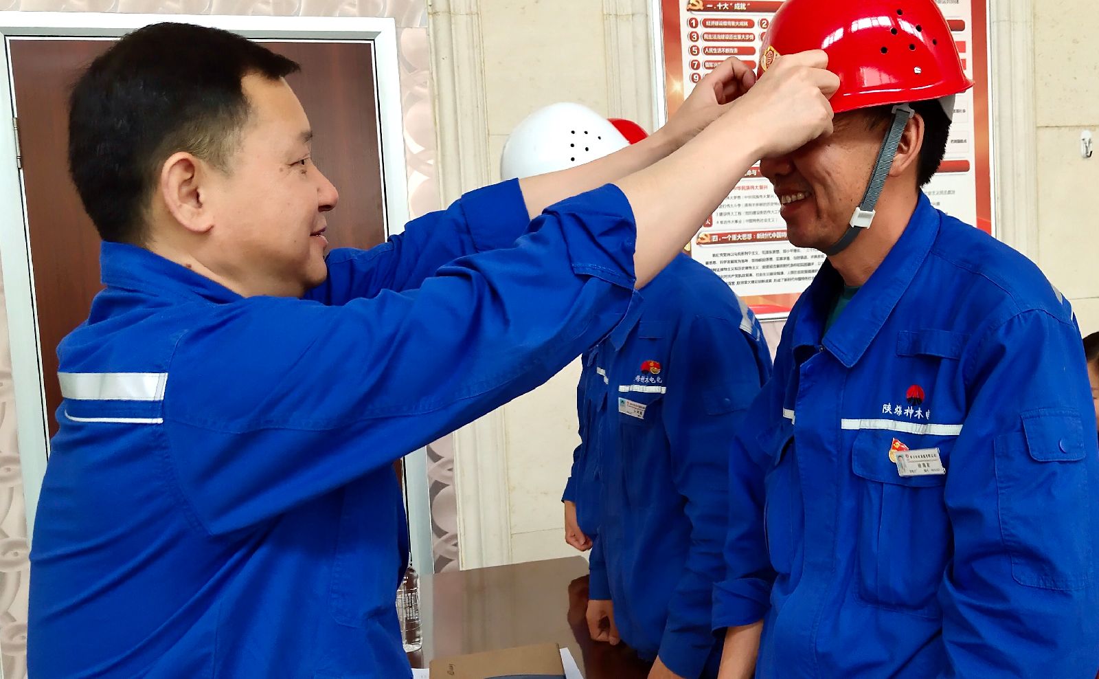 “身為黨員的我們,從黨徽上帽的那一刻開始,我們就亮明了身份,所以大家一定要注意自己的一言一行,要敢于亮劍,尤其是在安全生產方面,把黨員先鋒模范作用發揮出來,要勇于承擔更多的責任,干更多的活,要零容忍一切的三違行為。”公司黨委書記、董事長辛文輝邊說邊為熱電運行黨支部的黨員們貼上身份標簽。