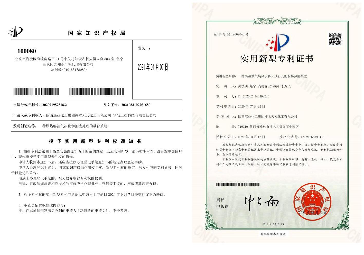 近日,天元公司申請的“一種高溫油氣旋風設備及具有其的粉煤熱解裝置”及“一種煤熱解油氣凈化和油渣處理的耦合系統”2件實用新型專利獲得國家知識產權局授權。