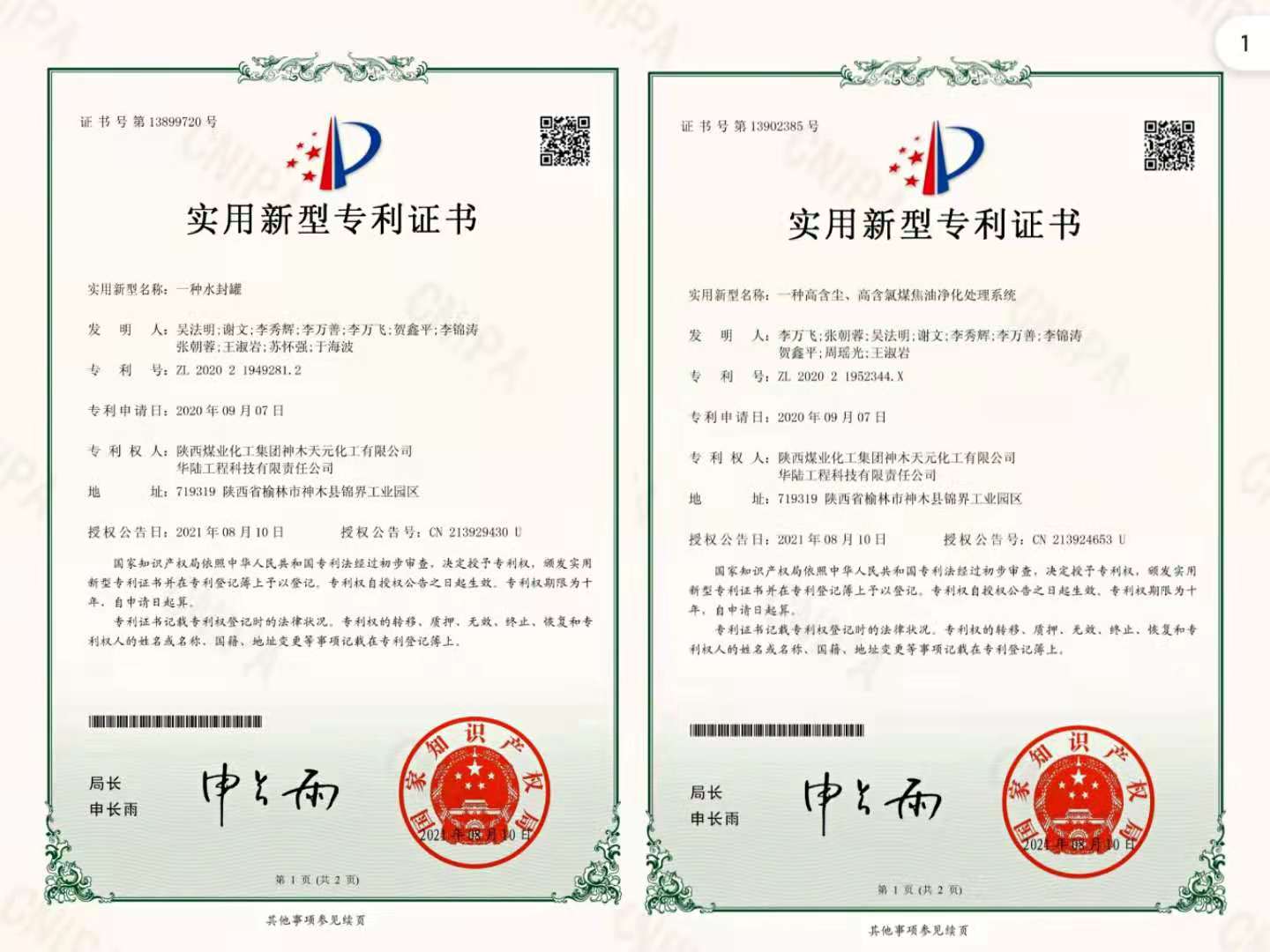 上述獲得授權(quán)的2件專利分別為“一種高含塵、高含氯煤焦油凈化處理系統(tǒng)”“一種水封罐”?!耙环N高含塵、高含氯煤焦油凈化處理系統(tǒng)”解決的技術(shù)問題在于克服現(xiàn)有技術(shù)中在對煤焦油進行凈化時,不能充分降低粉塵和氯含量,不能滿足煤焦油后續(xù)加工的要求等問題;“一種水封罐”解決的技術(shù)問題在于克服現(xiàn)有的水封罐罐體底部的灰塵不易清理,且無法在水封罐工作時同步清理的缺陷。