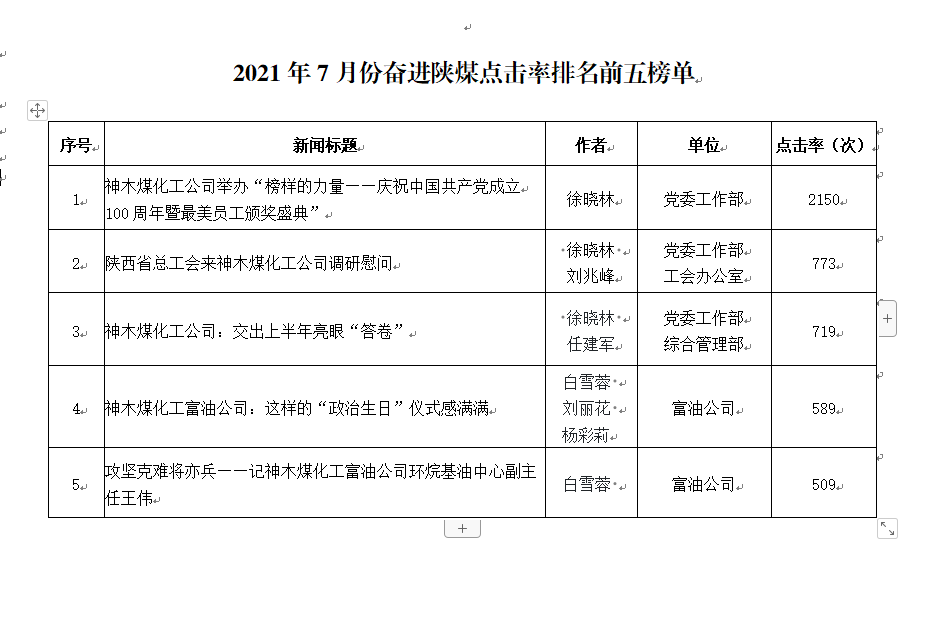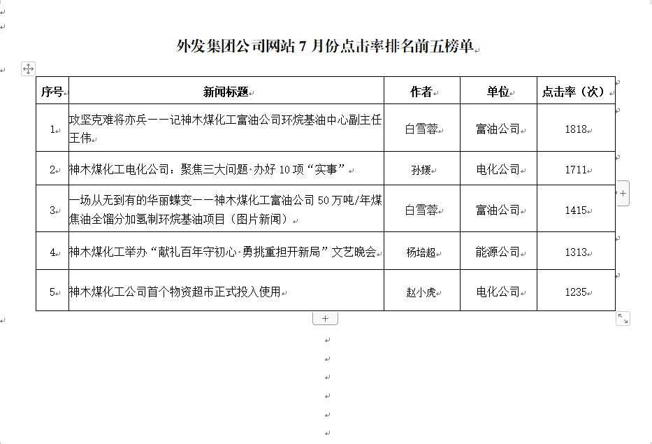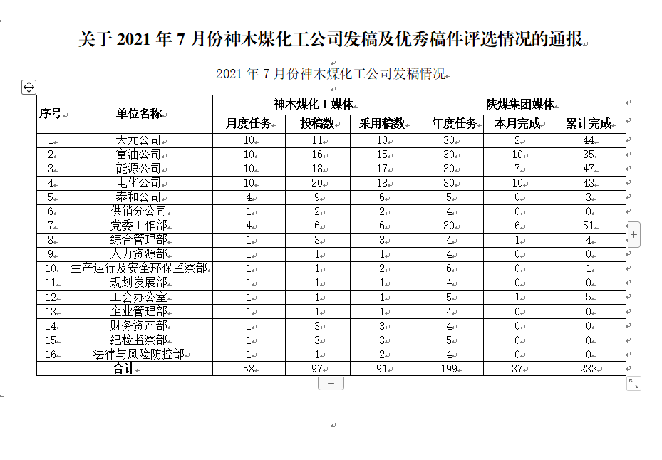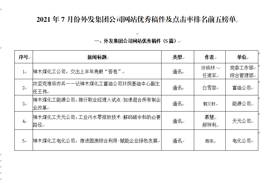 關(guān)于2021年7月份神木煤化工公司發(fā)稿及優(yōu)秀稿件評(píng)選情況的通報(bào)