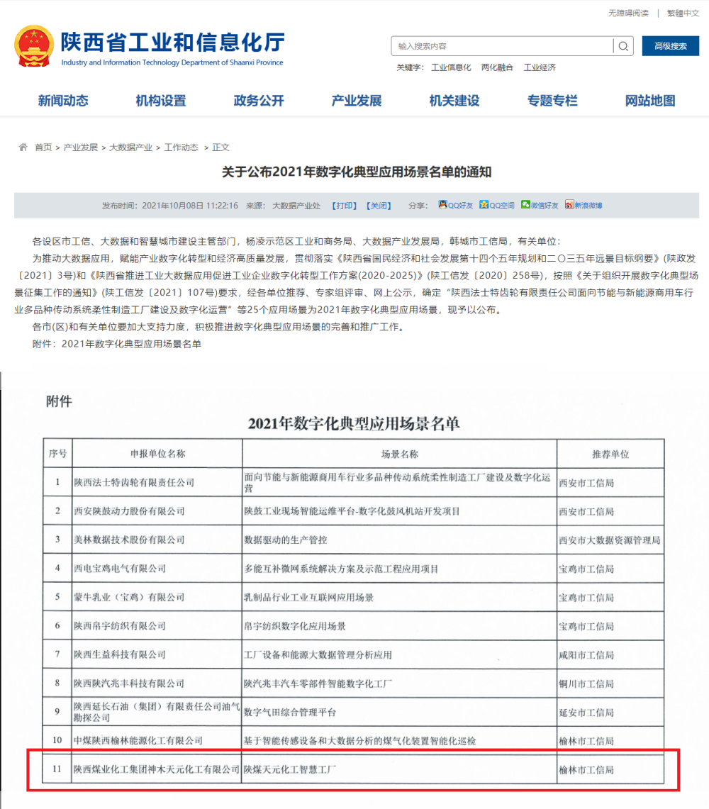陜煤集團微信:“陜煤天元化工智慧工廠”入選陜西省2021年數(shù)字化典型應用場景名單