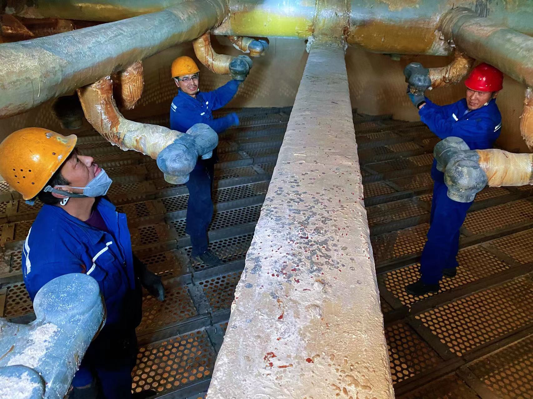 與此同時,本次檢修還以“降本增效”為依托,兩大分廠雙管齊下,不斷取得新突破。為了電石爐降低電耗,提高產量,電化公司利用此次檢修將5#電石爐殼進行擴容改造,把爐內徑由9950mm擴大至10200mm,對耐火磚爐墻重新進行了砌筑,為的就是大修后達到降低爐殼表面溫度,杜絕出現爐墻發紅、冒火、燒穿等事故的效果。通過一次次審圖、試驗,想方設法克服擴容后出爐平臺間隙間距狹窄、內層材料砌筑質量要求嚴格等一系列棘手問題。再看熱電分廠,濕煤泥系統的改造也是實現降本增效和解決固廢問題的關鍵所在。但是面對煤泥管道的疏通和爐頂開孔50余根讓管焊接的問題,電化公司副總經理惠曉鵬帶領技術人員駐扎一線,提前一個月進行煤泥輸送管道疏通確認,遇到問題就地開展現場會議討論方案。