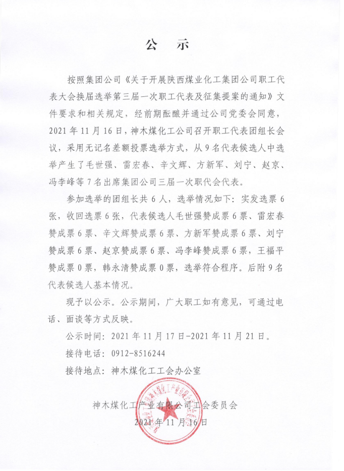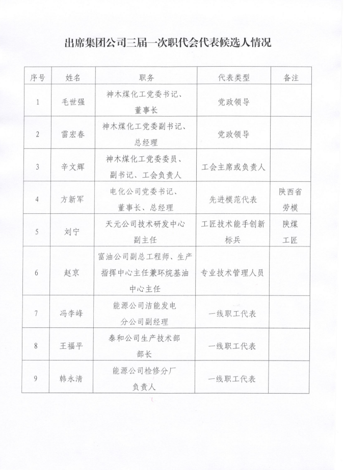 神木煤化工公司出席集團(tuán)公司三屆一次職代會(huì)代表公示