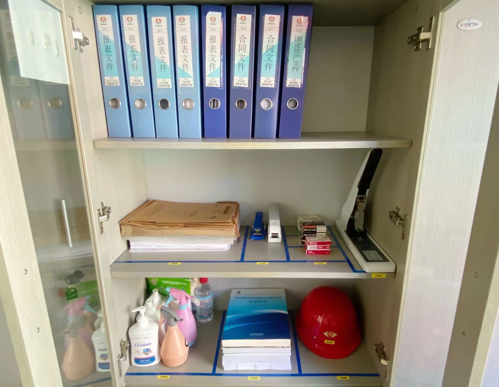物品定位,文件入盒,文件盒按顏色分區擺放,書籍排列整齊,清單一目了然。走進電化公司行政辦公室,干凈整潔的桌面、擺放整齊的書架格外矚目。