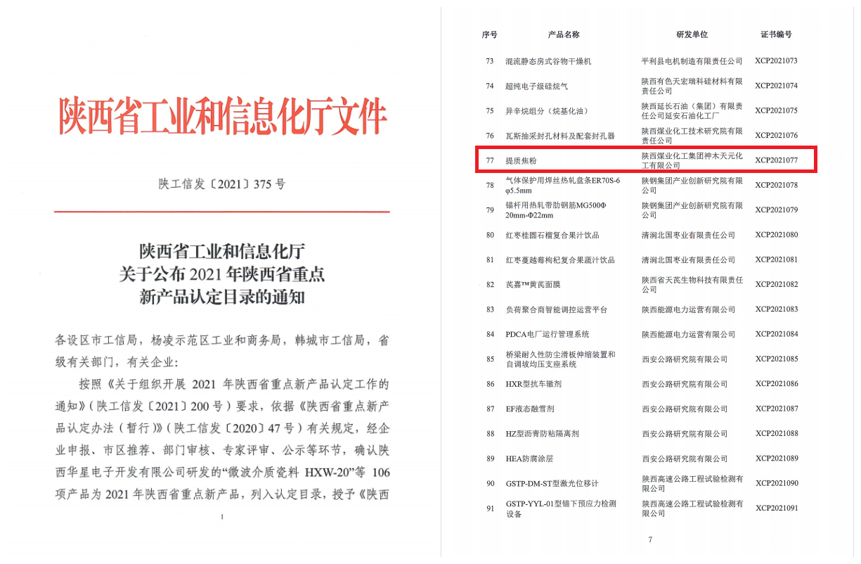 近日,陜西省工業和信息化廳下發了《關于公布2021年陜西省重點新產品認定目錄的通知》,經過申報、推薦、初審、專家評審、公示等多個環節,神木煤化工天元公司提質焦粉成功被認定為陜西省重點新產品,證書編號為XCP2021077。