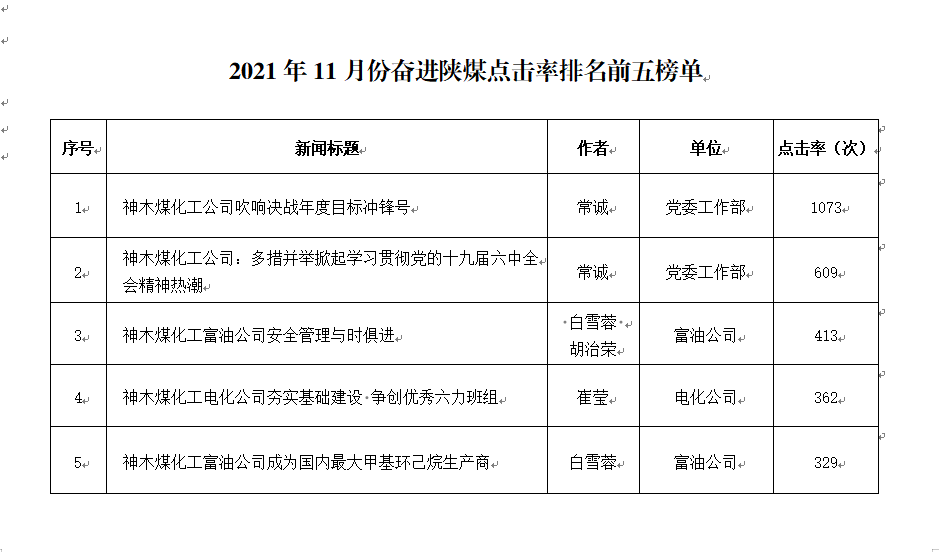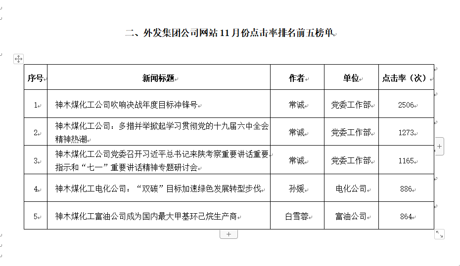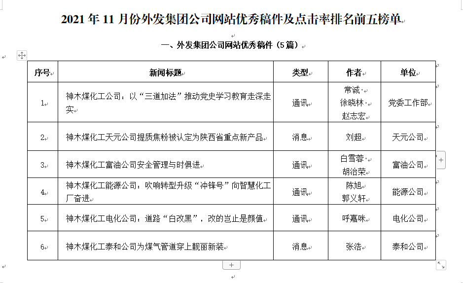 關于2021年11月份神木煤化工公司發稿及優秀稿件評選情況的通報