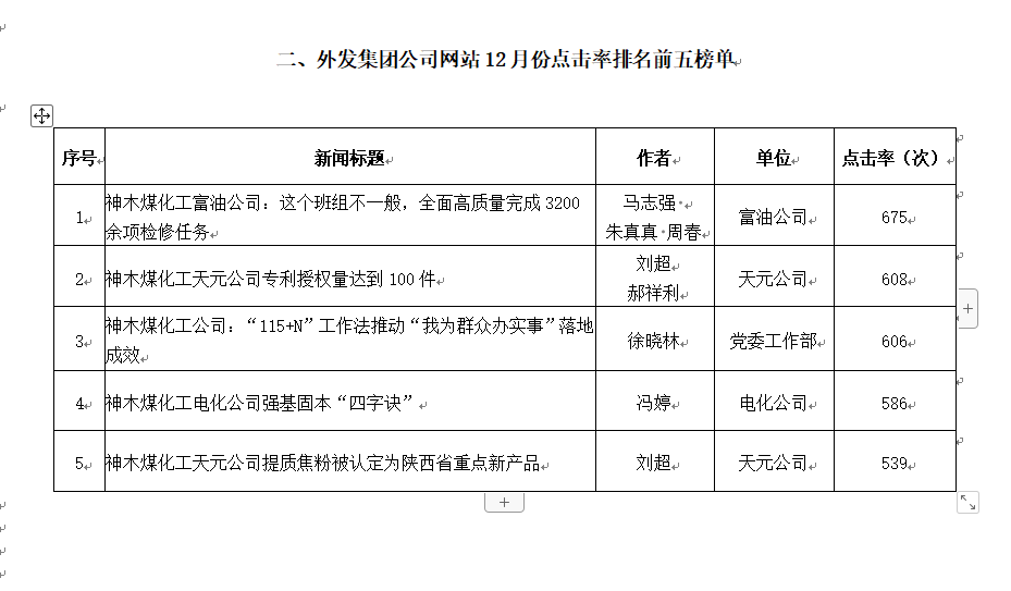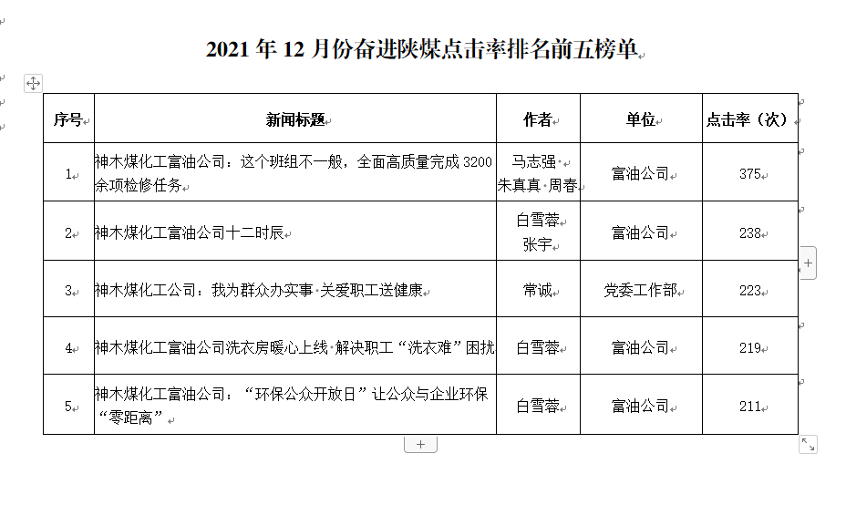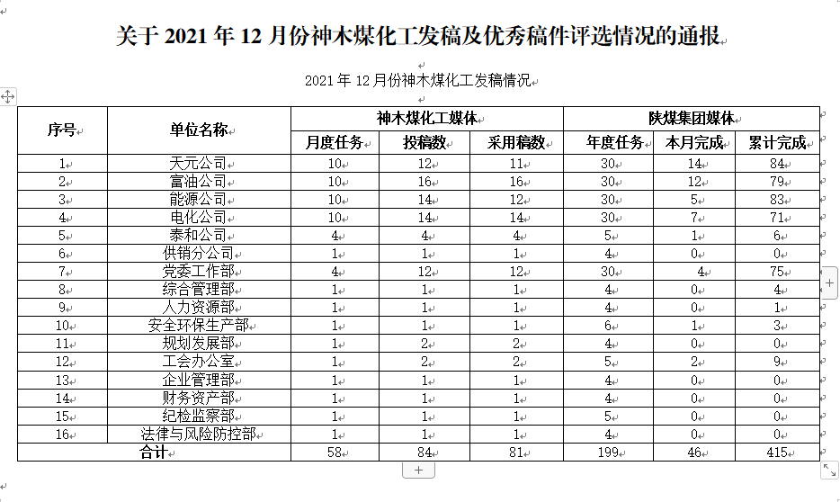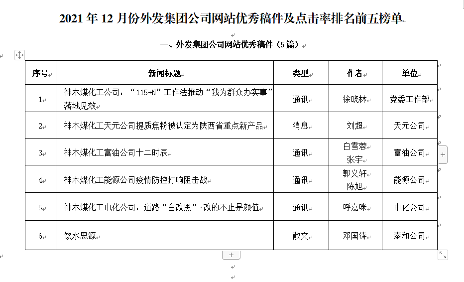 關(guān)于2021年12月份神木煤化工公司發(fā)稿及優(yōu)秀稿件評選情況的通報